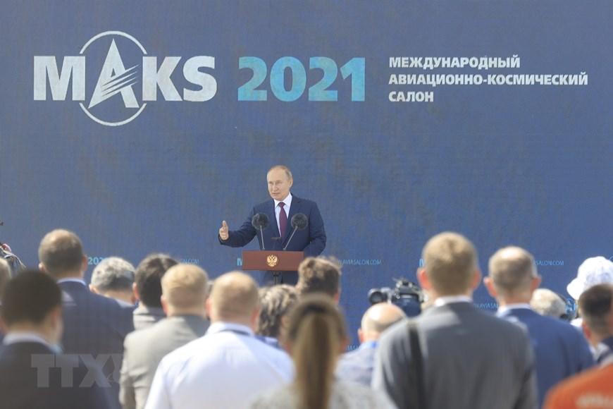 Tổng thống Nga Vladimir Putin phát biểu khai mạc triển lãm Hàng không và vũ trụ quốc tế Moskva 2021. (Ảnh: Trần Hiếu/TTXVN) |
