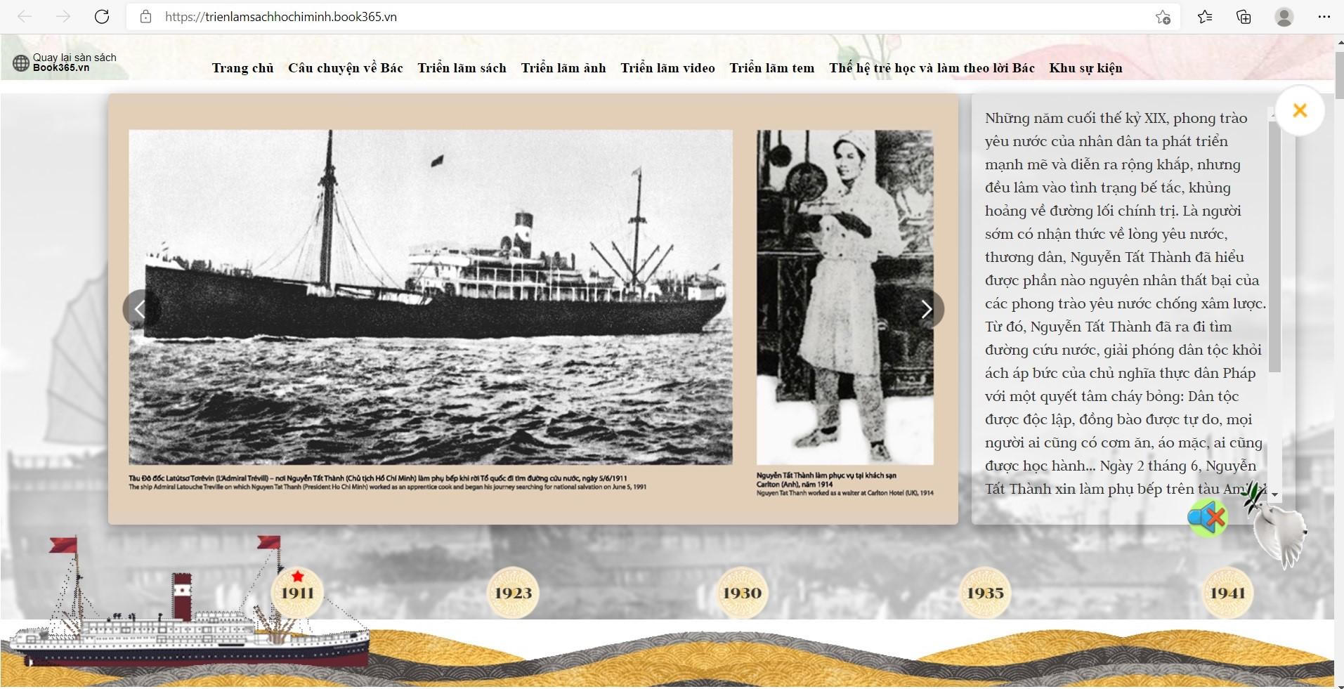 Triển lãm sách trực tuyến chào mừng kỷ niệm 110 năm Ngày Bác Hồ ra đi tìm đường cứu nước do Cục Xuất bản, In và Phát hành chủ trì, phối hợp với Tổng Công ty Bưu điện Việt Nam, Bảo tàng Tuổi trẻ, Trung ương Đoàn TNCS Hồ Chí Minh, Bảo tàng Công an nhân dân, Thư viện Quân đội nhân dân cùng các nhà xuất bản, đơn vị phát hành sách trong cả nước được thiết kế và sử dụng công nghệ hiện đại.