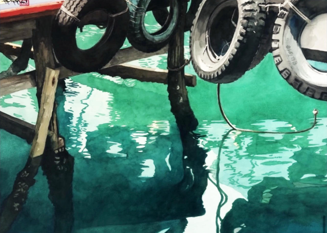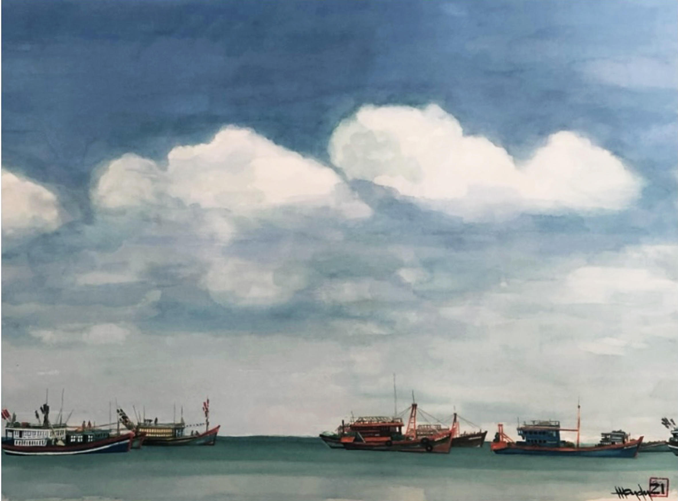 Hồng Quân tìm kiếm vẻ đẹp trong những khoảnh khắc thường nhật, mà nếu không chú ý, thì có thể lướt qua, hoặc không thể nhận ra. Như trong bức “Vùng biển xanh”, đó là phút giây trò chuyện của hai ngư dân sau chuyến ra khơi, trông thật thảnh thơi.