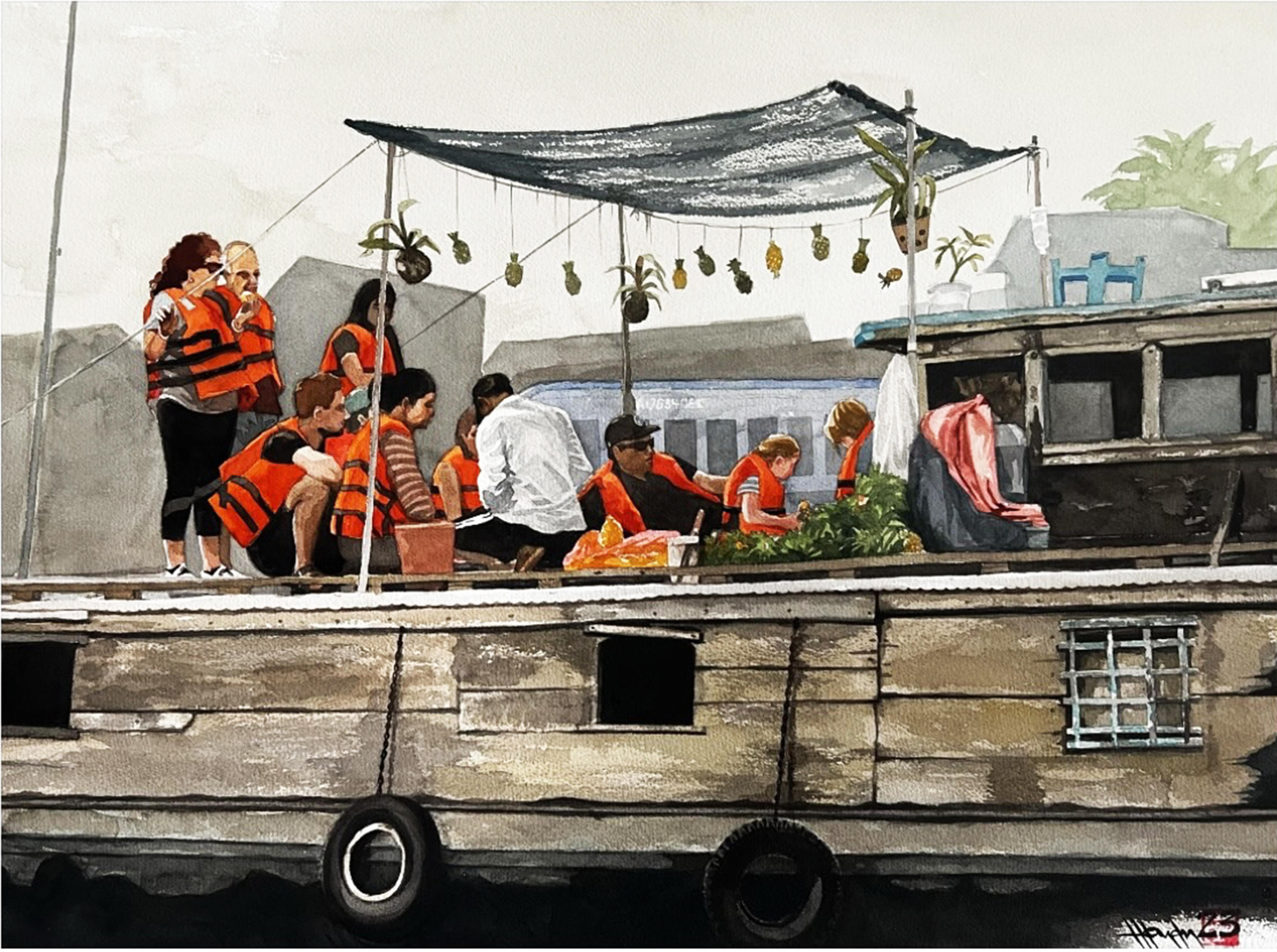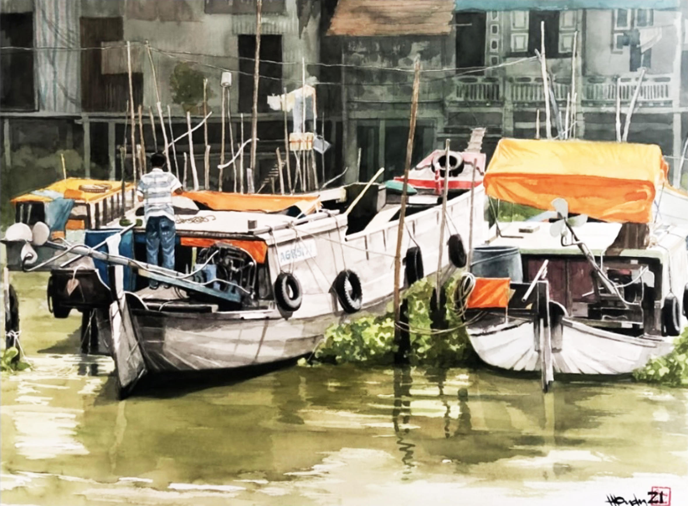 Bức “Sóng đôi” là cảnh hai con ngỗng bơi ngược dòng nước nhẹ, bên khóm lục bình, rặng dừa nước xanh tươi…, trông thật bình yên, hạnh phúc. Bức “Nhà và ghe trên sông Hậu”, đây có thể là giây phút nghỉ trưa, con người “đi vắng”, chỉ còn lại cái bến bình yên. Hoặc như bức “Nhà thuốc thời COVID-19”, vẽ một giai đoạn vô cùng khó khăn của loài người, nhưng anh cũng chọn một góc nhìn tích cực, giàu sức sống. Đây cũng là tinh thần chung của đa số tranh Hồng Quân.