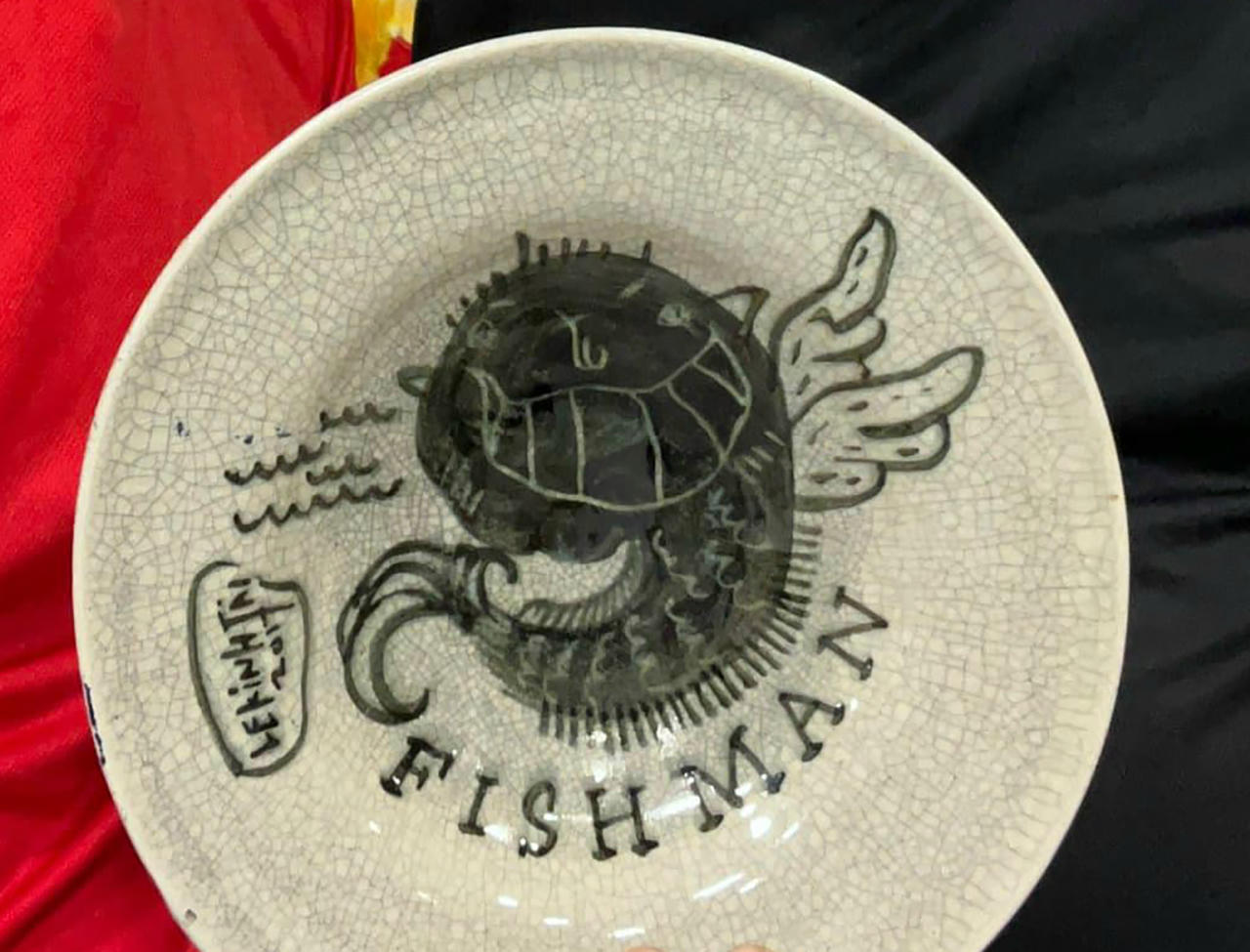 Họa sĩ Lê Kinh Tài mang đến tác phẩm vẽ trên đĩa gốm mang tên Fishman. Ảnh: BTC |