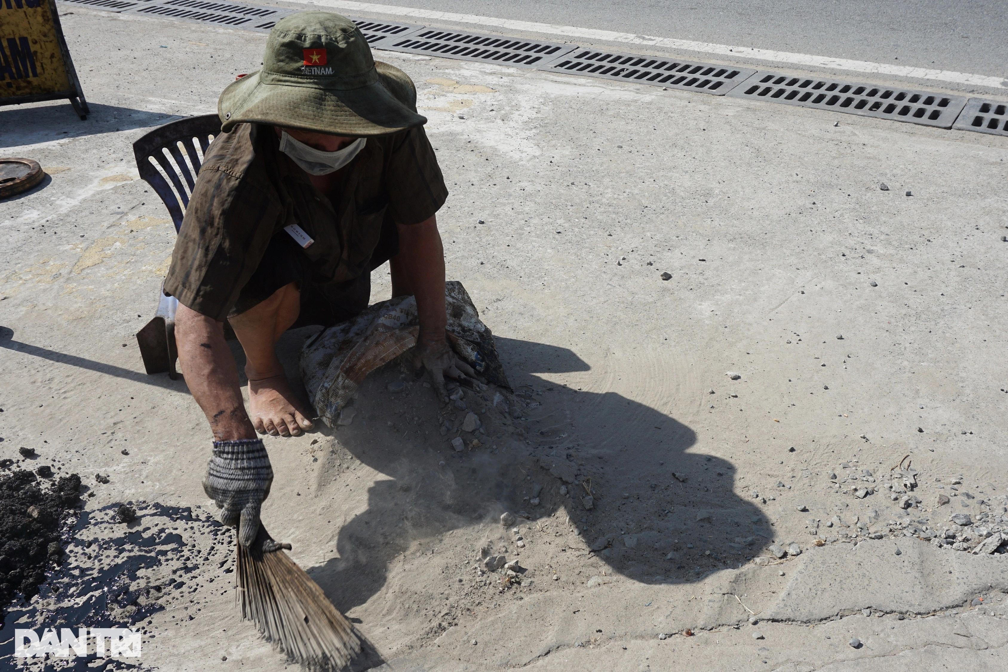 Ông Ba luôn dọn sạch bụi đường để lớp nhựa mới bám chặt bền chắc nhất (Ảnh: Nguyễn Cường).