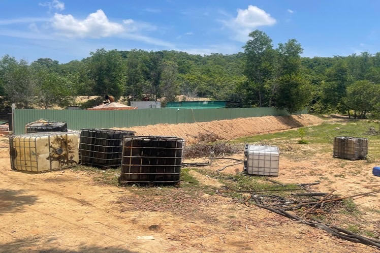 Cơ sở tái chế nhớt trái phép được che chắn bởi hàng rào tôn quây xung quanh. |