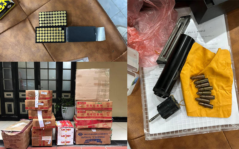 Cơ quan công an đã thu giữ 12 điện thoại di động, 1 hộp tiếp đạn, 107 viên đạn các loại, 1 ống giảm thanh sử dụng cho súng ngắn, 1 ổ đạn sử dụng cho súng colt ổ quay, 205,5kg pháo nổ, 100 triệu đồng tiền mặt và nhiều giấy tờ, tài liệu liên quan đến các hoạt động đánh bạc, cho vay lãi nặng của ổ nhóm trên.