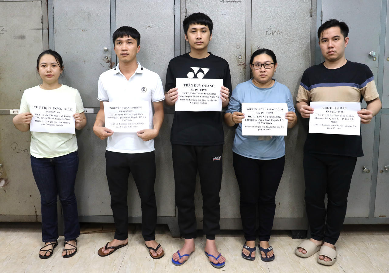 Ngày 11/9, cơ quan Cảnh sát điều tra Công an tỉnh Lào Cai bắt quả tang 6 đối tượng do Che Triệu Mãn (quốc tịch Việt Nam, dân tộc Hoa, sinh năm - SN 1996, trú tại Chung cư Tân tạo 1, phường Tân Tạo A, quận Bình Tân, TP HCM) cầm đầu cùng Trần Duy Quang (SN 1999, hộ khẩu thường trú - HKTT xã Đại Đồng, huyện Thanh Chương, tỉnh Nghệ An), Chu Thị Phương Thảo (SN 1999, HKTT xã Thanh Tân, huyện Thanh Liêm, tỉnh Hà Nam), Nguyễn Thanh Phong (SN 1991, HKTT phường 21, quận Bình Thạnh, TP HCM), Nguyễn Huỳnh Phương Mai (SN 1993, HKTT phường 7, quận Bình Thạnh, TP HCM) có hành vi làm giả con dấu, tài liệu của Cơ quan, tổ chức, hoạt động trên không gian mạng với số lượng lớn.