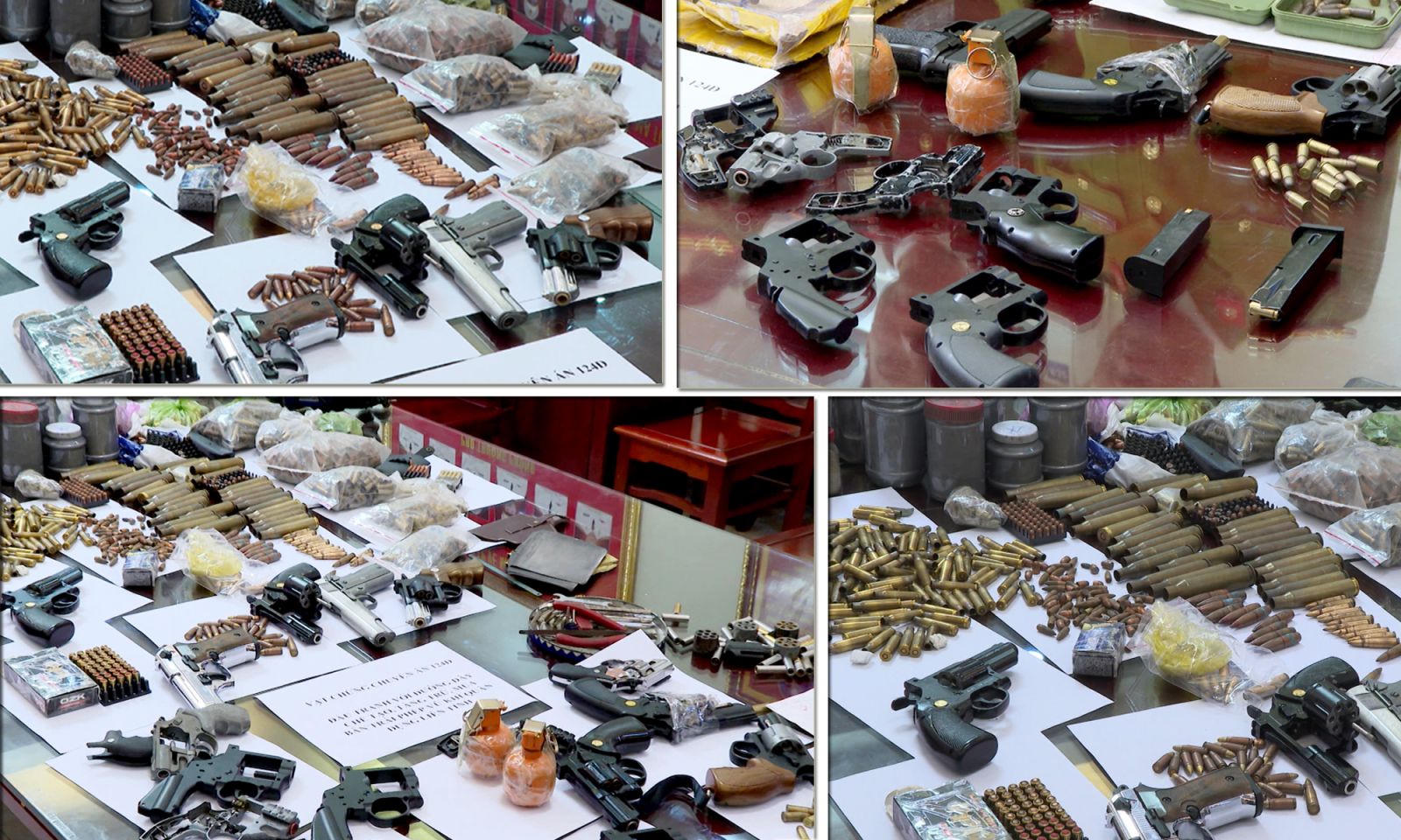 Khám xét khẩn cấp nơi ở của các đối tượng, lực lượng chức năng đã thu giữ 11 khẩu súng ngắn, 1 súng bút tự chế, 5 quả lựu đạn, 8 quả nổ tự chế, hàng nghìn viên đạn, đầu đạn, vỏ đạn của các loại súng, linh kiện chế tạo súng và máy móc, hoá chất, dụng cụ để chế tạo vũ khí...