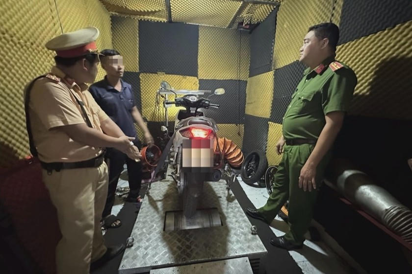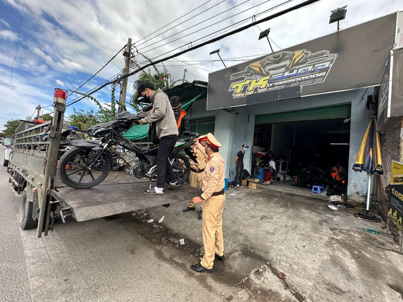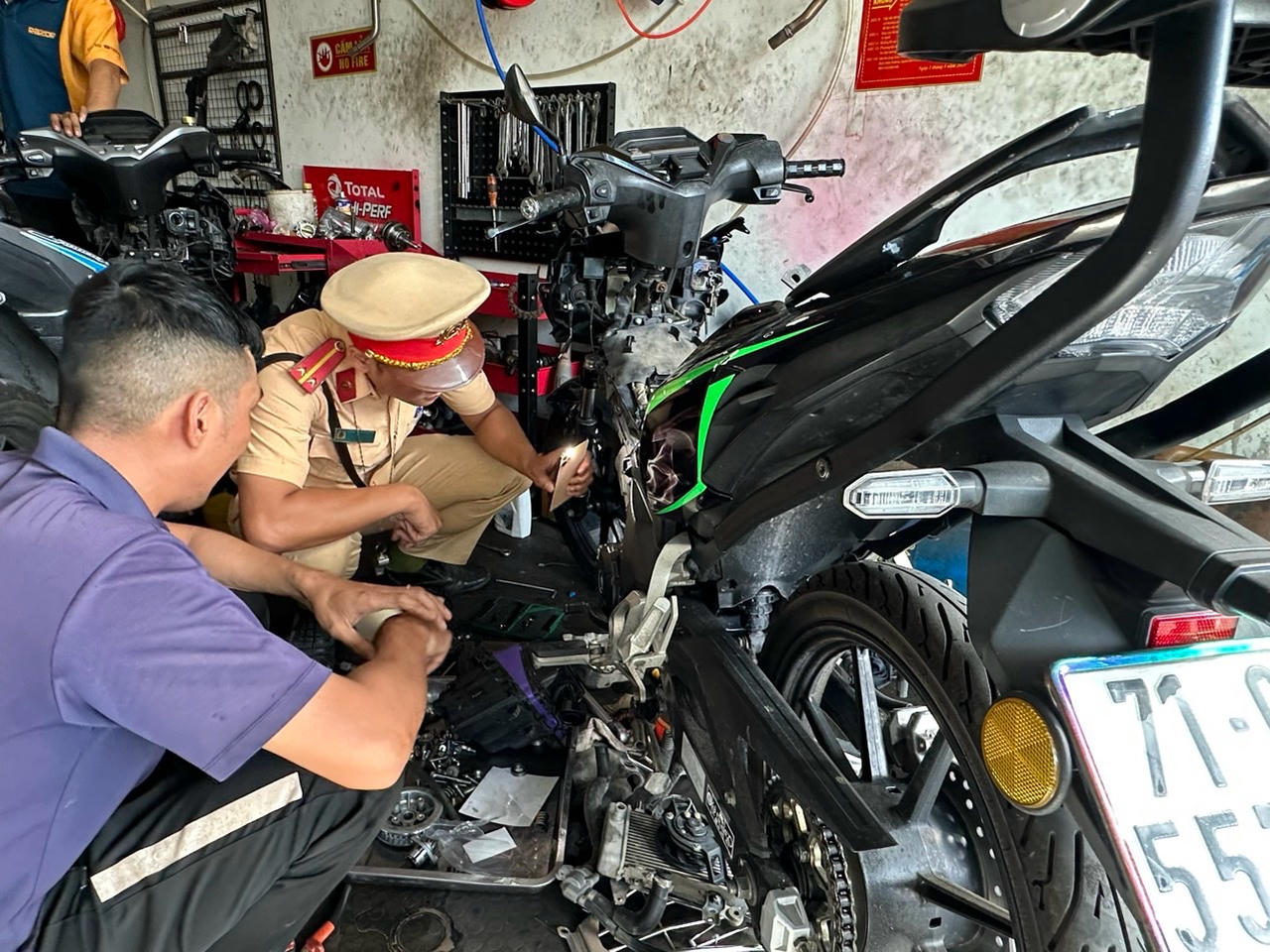 Quá trình kiểm tra, công an phát hiện 14 xe mô tô do 4 thợ sửa xe đang thực hiện các công đoạn lắp ráp, bảo dưỡng, thay thế phụ tùng, sửa chữa xe nhưng một số xe đã tháo rã, sửa chữa có dấu hiệu “độ, chế” công suất động cơ. Chủ tiệm sửa xe này còn trang bị 1 phòng cách âm, rộng khoảng 10 m2, có đầu tư hệ thống máy tính có phần mềm kết nối với phương tiện để đo tốc độ, tiêu chuẩn an toàn kỹ thuật cho phương tiện để phục vụ việc kiểm tra tốc độ phương tiện...