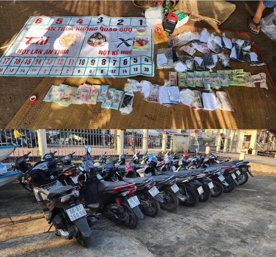 Nghe tiếng truy hô có Công an, nhiều con bạc nhanh chân bỏ chạy ra ruộng lúa phía sau để tẩu thoát. Tại hiện trường, Công an bắt giữ 30 người (trong đó có 09 nữ), tạm giữ số tiền trên chiếu bạc và trên người các đối tượng hơn 500 triệu đồng, 26 chiếc xe máy, 04 con gà, 01 bộ tài xỉu và một số tang vật khác có liên quan.