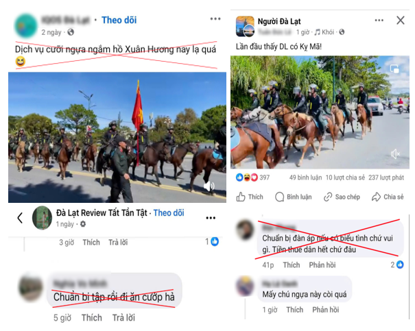 Cơ quan công an cũng phát hiện, làm việc với quản trị viên của các trang, hội nhóm cộng đồng lớn tại địa phương gồm: bà T.H (SN 1982) thường trú tại phường 6, TP Đà Lạt, là quản trị trang Facebook “I.Q.O.S Đà Lạt”) đã có hành vi đăng tải thông tin sai sự thật về hoạt động của Trung đoàn Cảnh sát Cơ động Kỵ binh CAND là “dịch vụ cưỡi ngựa ngắm hồ Xuân Hương…”; ông M.Đ (SN 1991) thường trú tại phường 4, TP Đà Lạt, đồng quản trị trang Facebook “Thông Tin Đà Lạt”).
