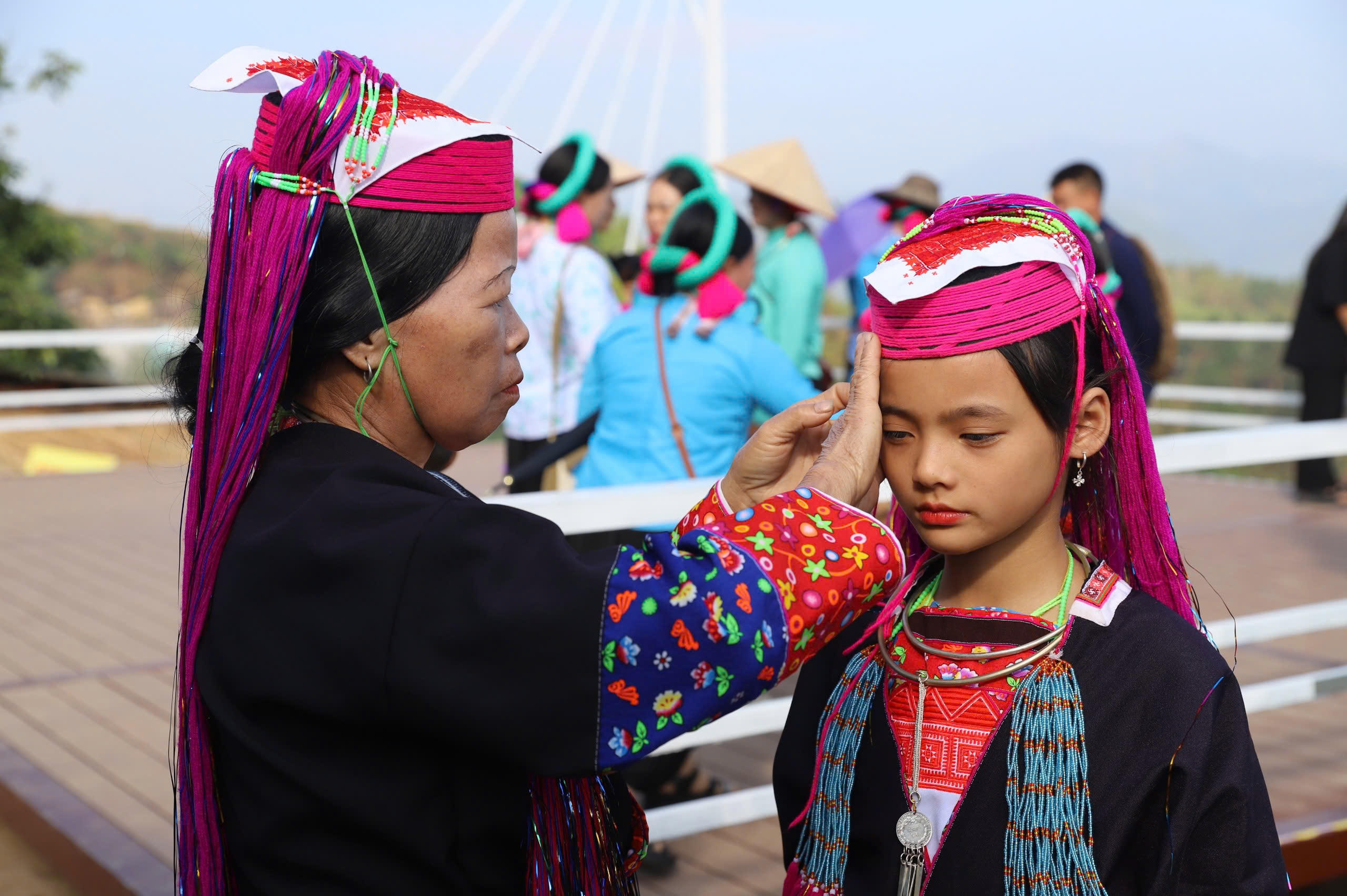 Bà nội chuẩn bị cho cháu lên trình diễn trang phục của người Dao Thanh Y. |