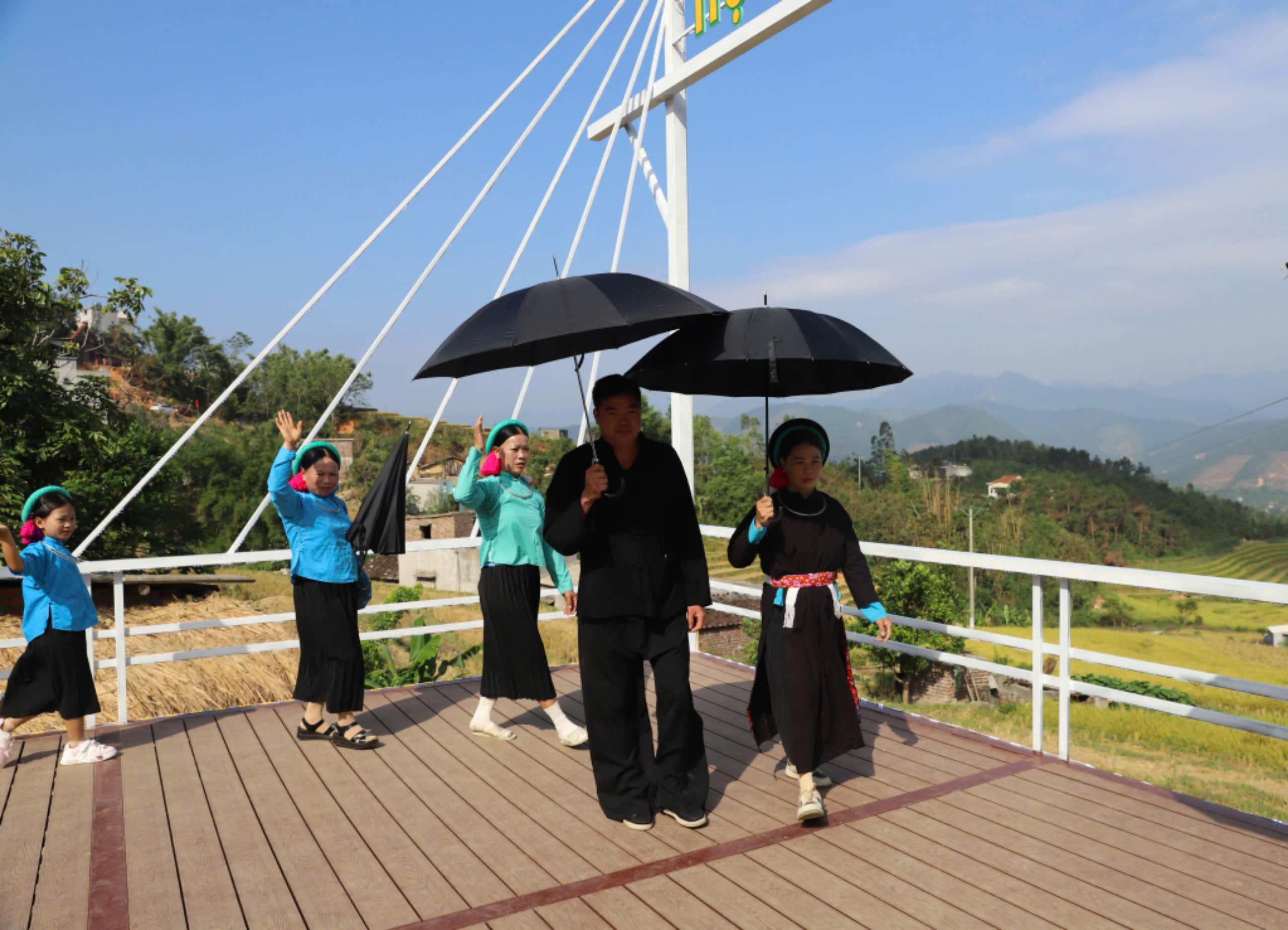 Trình diễn trang phục dân tộc Tày tại ruộng bậc thang thôn Cao Thắng. |