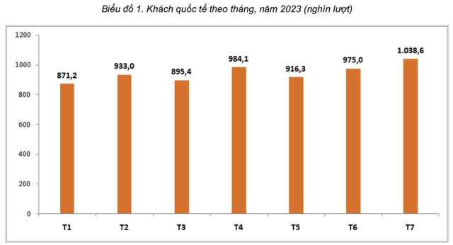 Tháng 7/2023 đánh dấu tháng đầu tiên kể từ đầu năm có hơn 1 triệu lượt khách quốc tế đến nước ta, với con số cụ thể là 1.038.000 lượt, tăng 6,5% so với tháng trước.