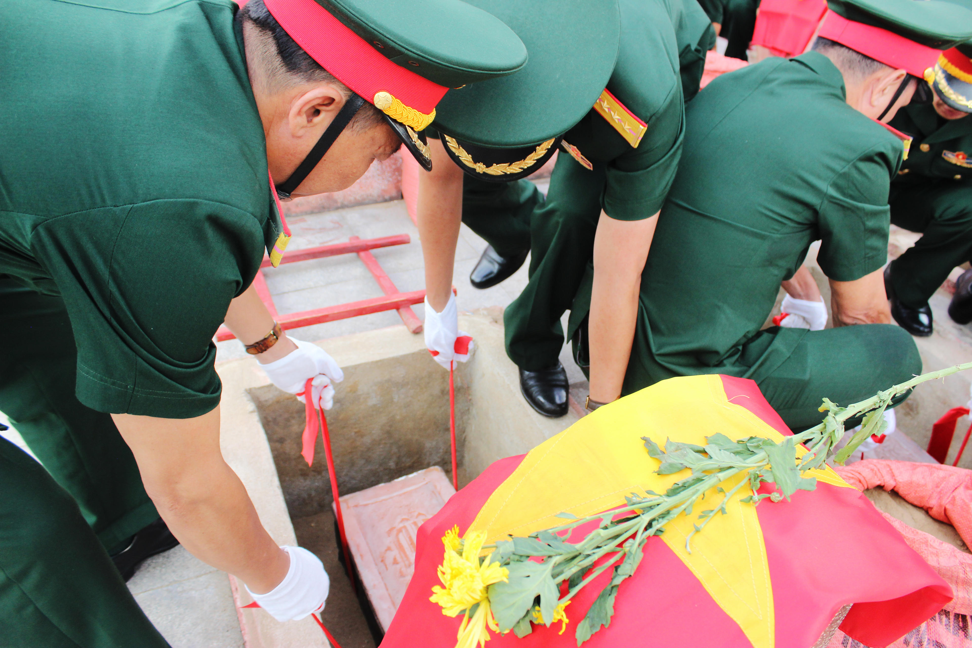 Các chiến sĩ bộ đội tiến hành hạ huyệt hài cốt của các anh hùng, liệt sĩ. Ảnh: Bùi Hoàng Ý |