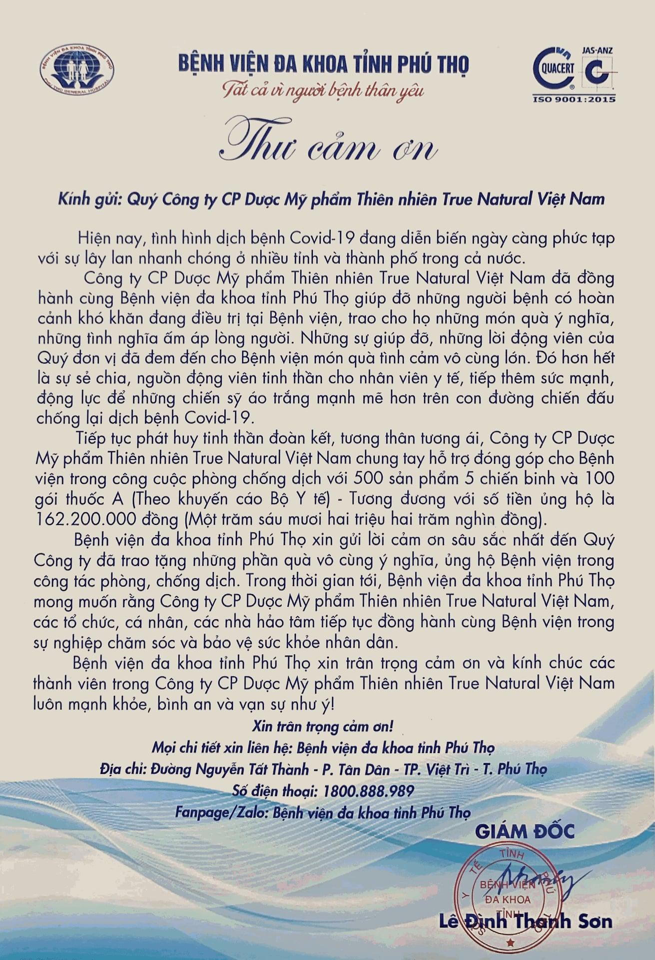 Bệnh viện Đa khoa tỉnh Phú Thọ cũng gửi lời cảm ơn đến những đóng góp kịp thời và ý nghĩa của công ty True Natural. |
