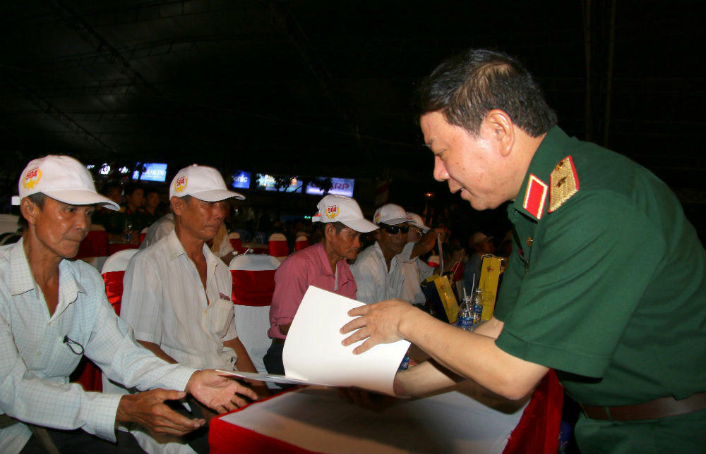 | Đại diện Cơ quan Thường trực Ban chỉ đạo Chương trình hành động quốc gia khắc phục hậu quả bom mìn sau chiến tranh tặng quà cho các nạn nhân của bơm mìm, vật nổ |