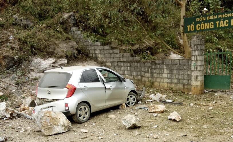 Khoảng 10 khối đá từ trên núi gần Tổ công tác Biên phòng xóm Lũng Phiắc lăn xuống làm hư hỏng nặng mái tôn, tường nhà; làm hư hỏng 1 chiếc xe ô tô Kia Morning.
