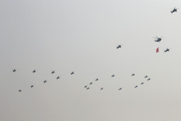 Các máy bay trực thăng của Trung Quốc đã bay theo hình số 70 trong khi các binh sỹ duyệt binh.