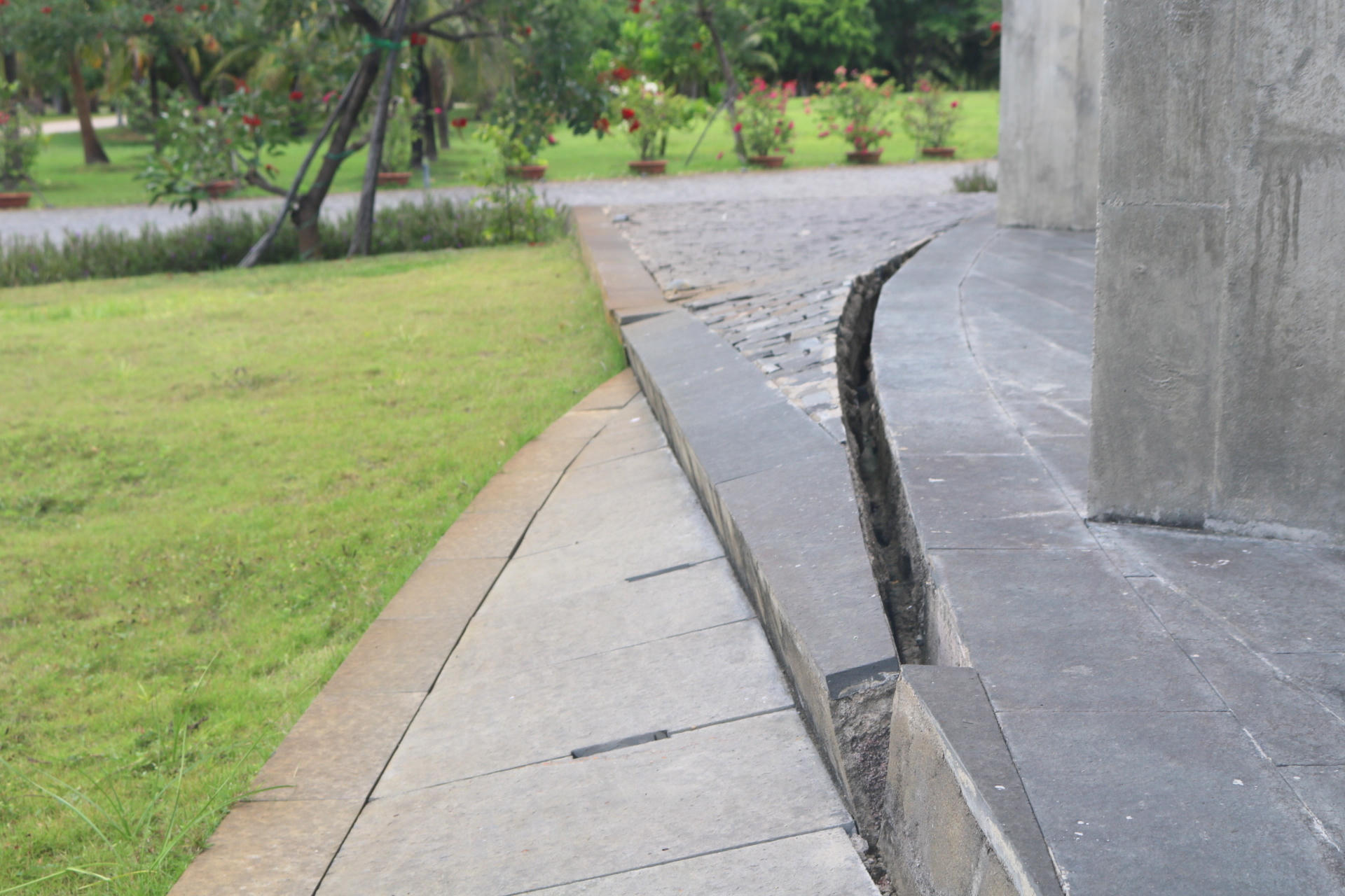 Ngoài ra, công trình được xây dựng trên nền đất trồng lúa, theo thời gian thì đất nền bị sụt lún, dẫn đến những lớp gạch nền bị bong tróc nên phải bảo dưỡng, gia cố lại những chỗ bị hư hỏng.