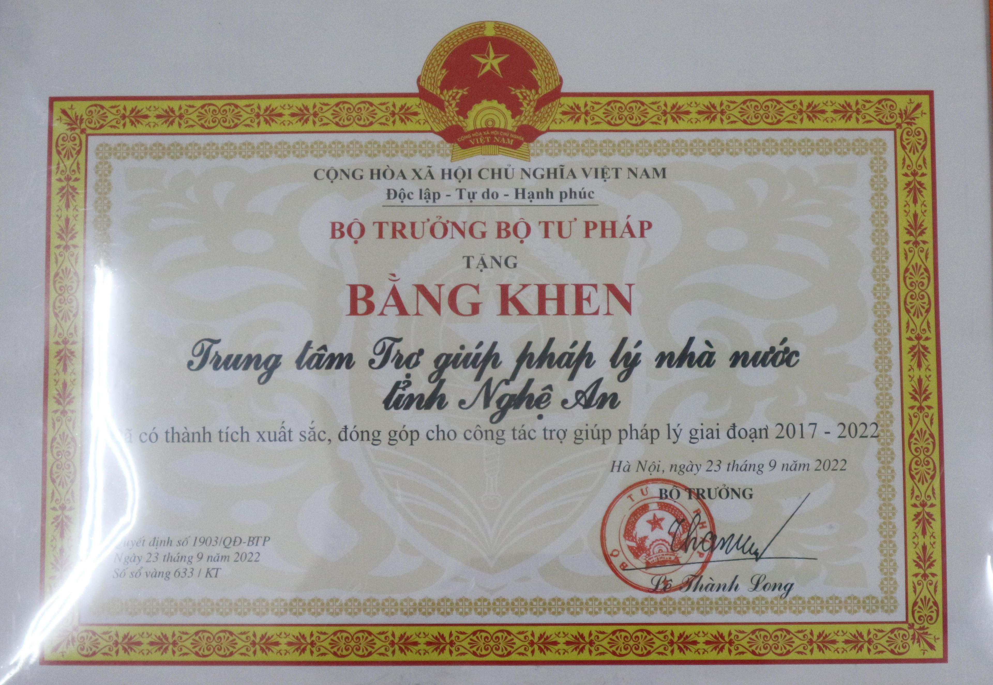 Trung tâm đã 3 lần được Bộ trưởng Bộ Tư pháp tặng Bằng khen. |