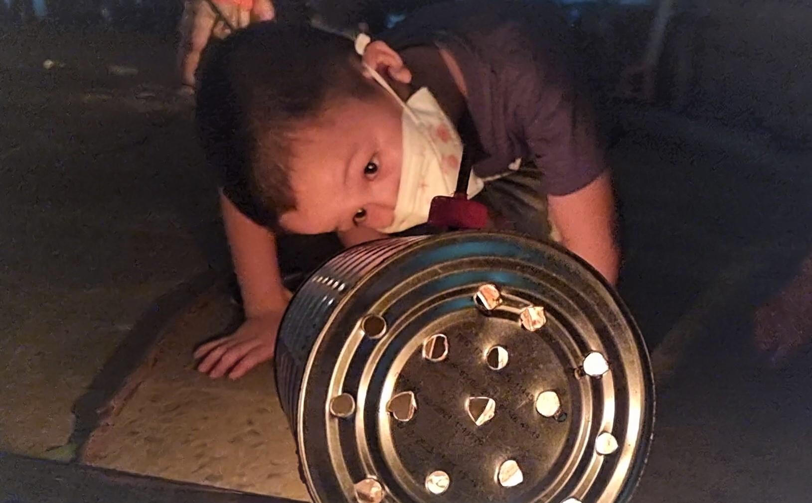 Đèn ống lon (đèn loong), loại lồng đèn từ xa xưa của những em bé ở vùng nông thôn nghèo được tái hiện. |