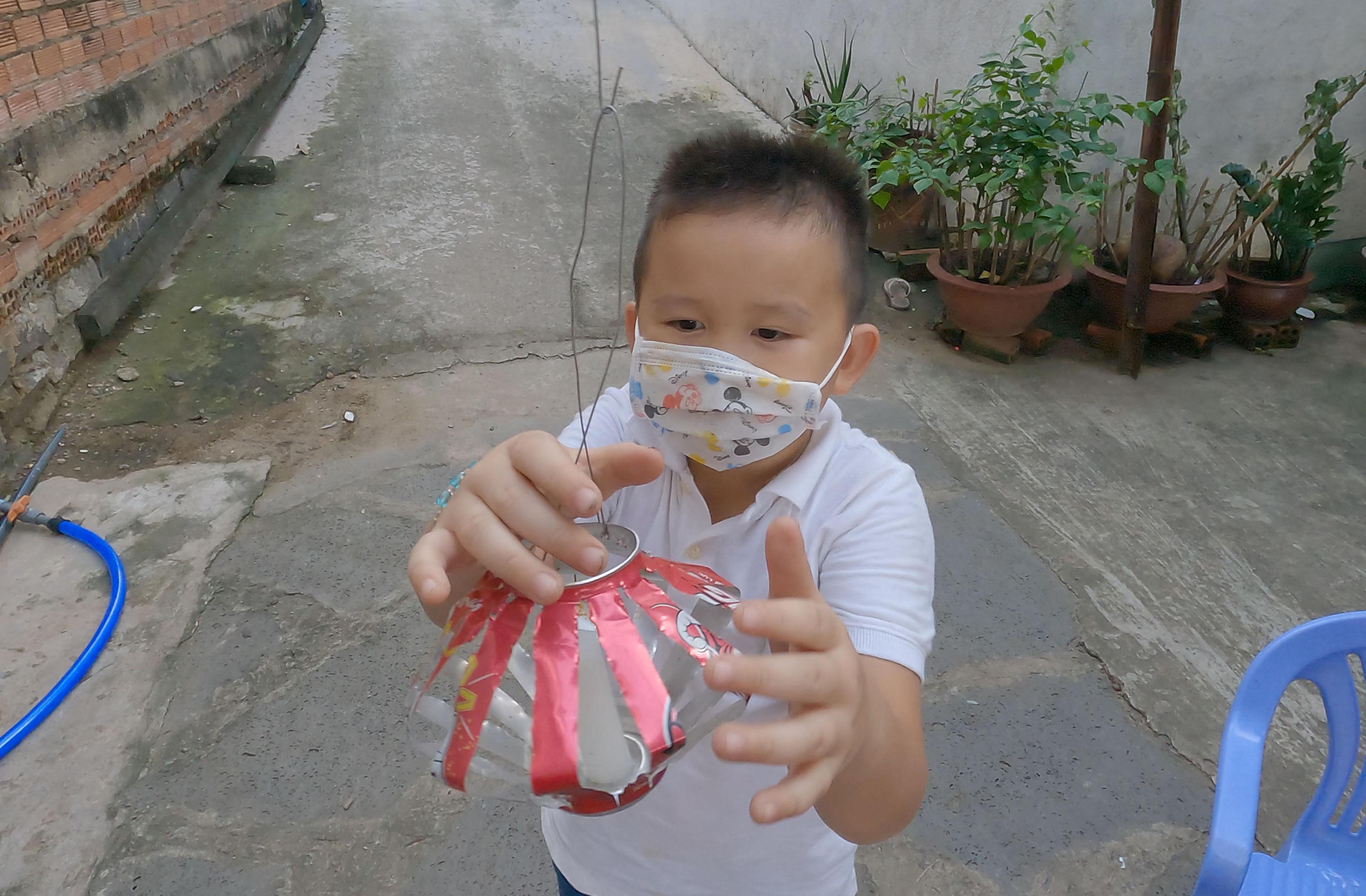 Anh Nguyễn Văn Thập, ngụ xã Bắc Sơn, huyện Trảng Bom, tỉnh Đồng Nai thu gom tất cả lon bia, lon nước ngọt và hộp sữa bột để tự tay chế tạo đèn trung thu cho con trai 5 tuổi và bạn con. |