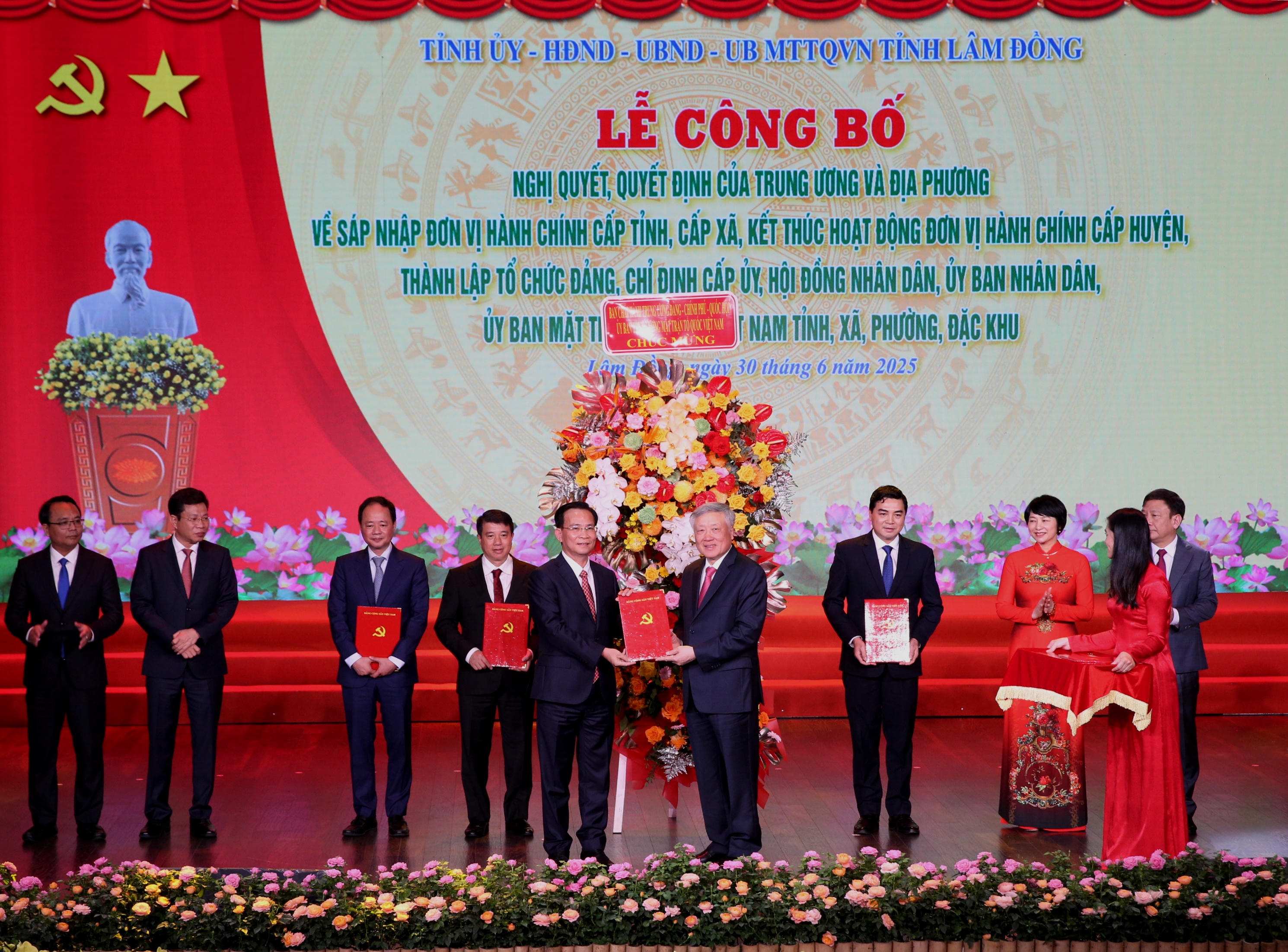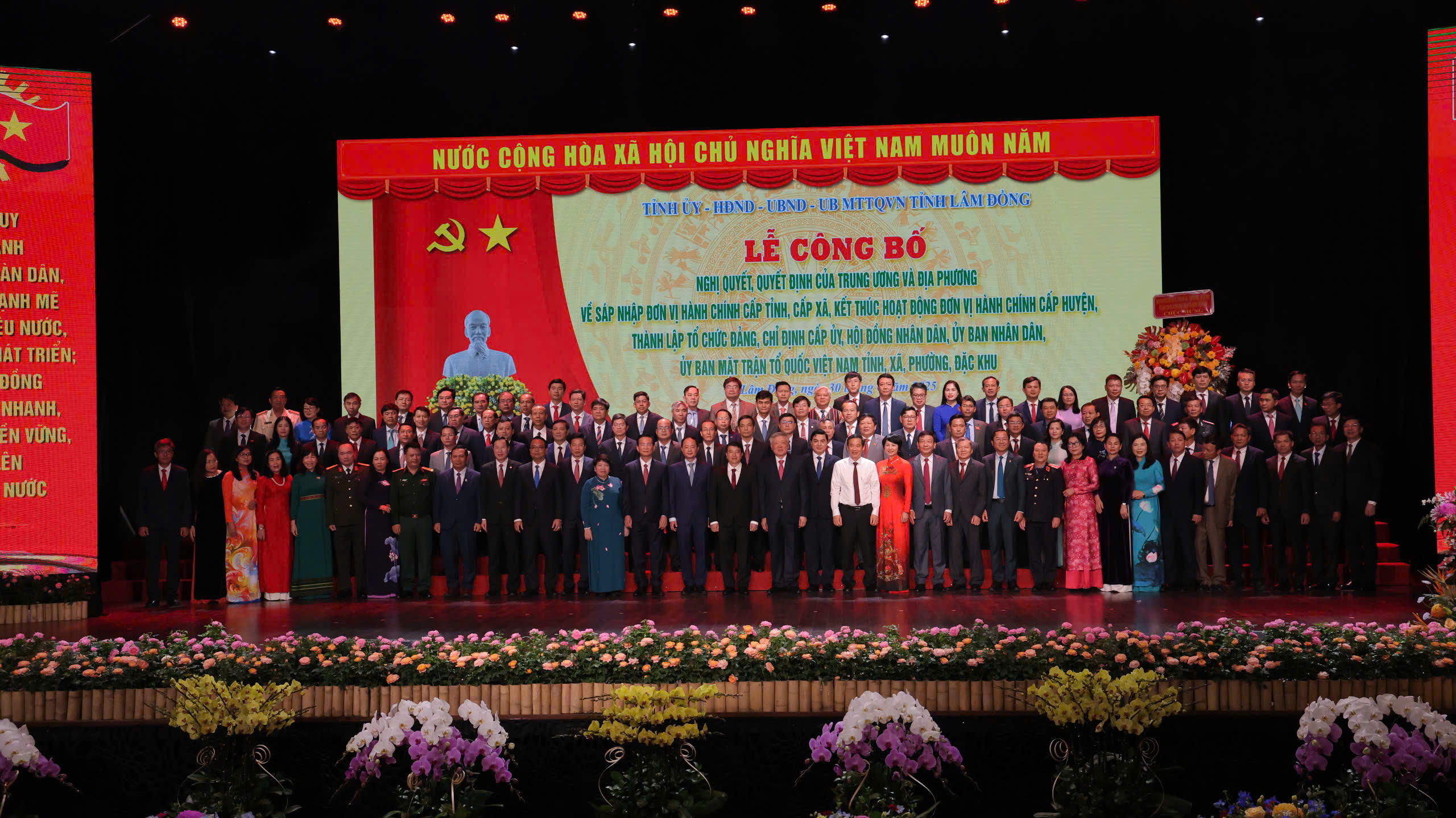 Trước đó, đại diện Đoàn công tác của Trung ương, bà Nguyễn Thuý Anh - Ủy viên Ban Chấp hành Trung ương Đảng, Phó Trưởng Ban Chính sách, chiến lược Trung ương công bố 9 Nghị quyết, Quyết định của Trung ương đối với việc sáp nhập tỉnh; chỉ định nhân sự tỉnh Lâm Đồng (mới). Tỉnh Lâm Đồng (mới) được hợp nhất từ ba tỉnh: Lâm Đồng, Đăk Nông và Bình Thuận; trung tâm hành chính đặt tại TP Đà Lạt. Sau sáp nhập, tỉnh có diện tích hơn 24.233 km2, lớn nhất nước; dân số hơn 3,8 triệu người, gồm 124 đơn vị hành chính cấp xã.