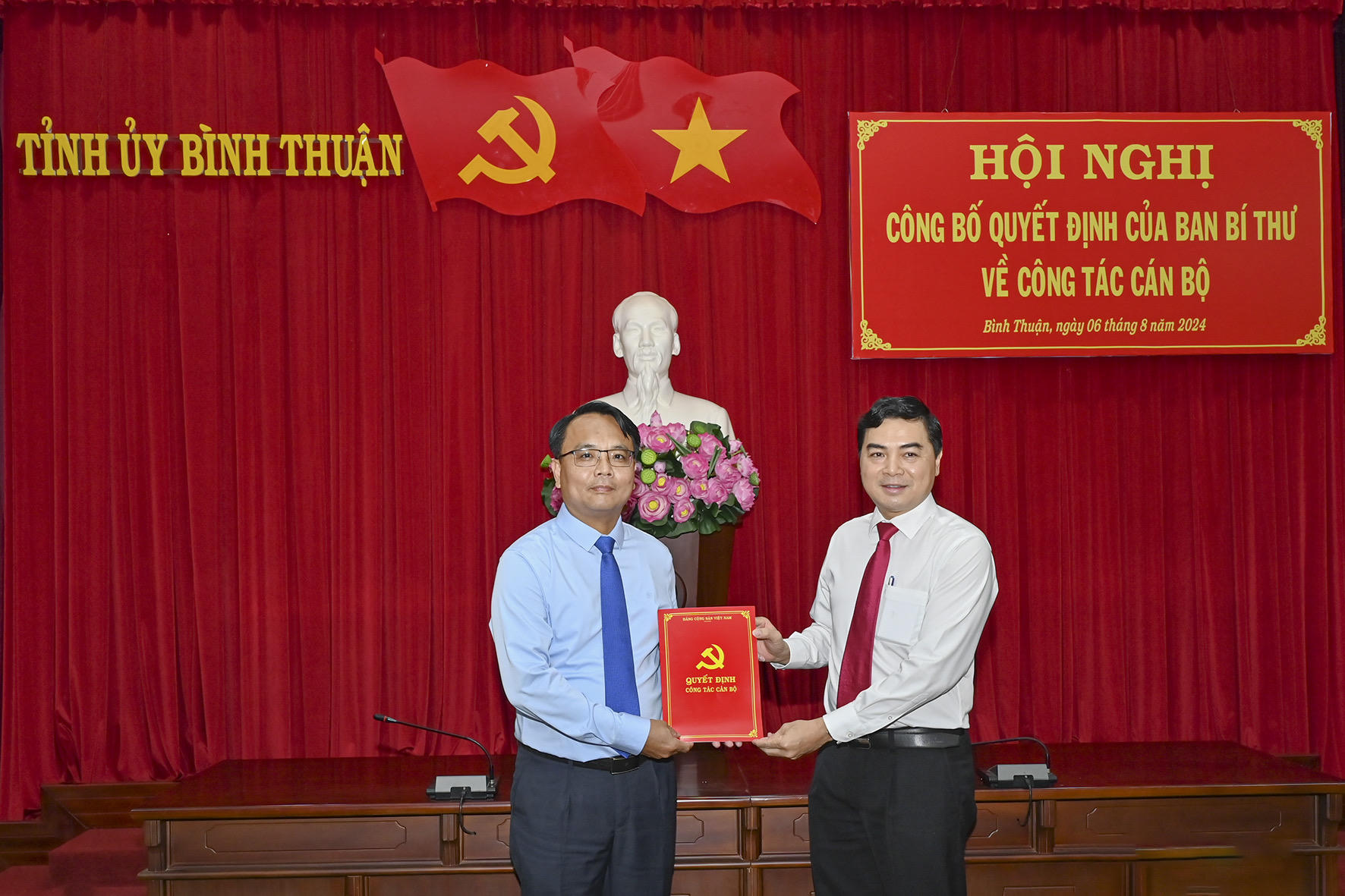Ông Nguyễn Hoài Anh - Bí thư Tỉnh ủy, Chủ tịch HĐND tỉnh Bình Thuận (bên phải) trao quyết định của Ban Bí thư cho ông Đặng Hồng Sỹ. |