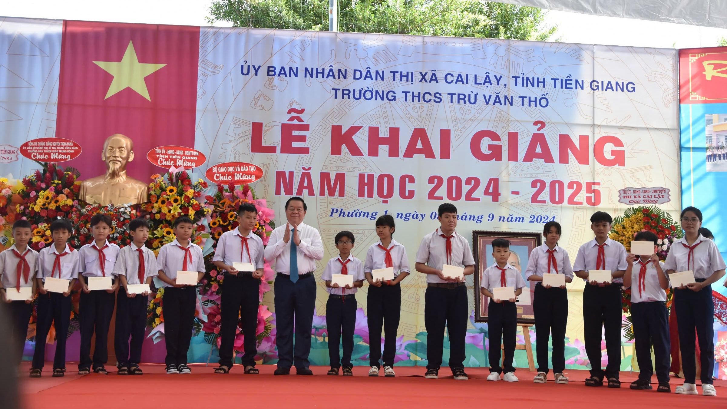 (PLVN) - Sáng 5/9, Ban giám hiệu nhà trường cùng hơn 1.400 học sinh Trường Trung học cơ sở (THCS) Trừ Văn Thố (phường 1, thị xã Cai Lậy) vui mừng đón Ủy viên Bộ chính trị, Bí thư Trung ương Đảng, Trưởng Ban Tuyên giáo Trung ương Nguyễn Trọng Nghĩa về dự lễ khai giảng năm học mới.