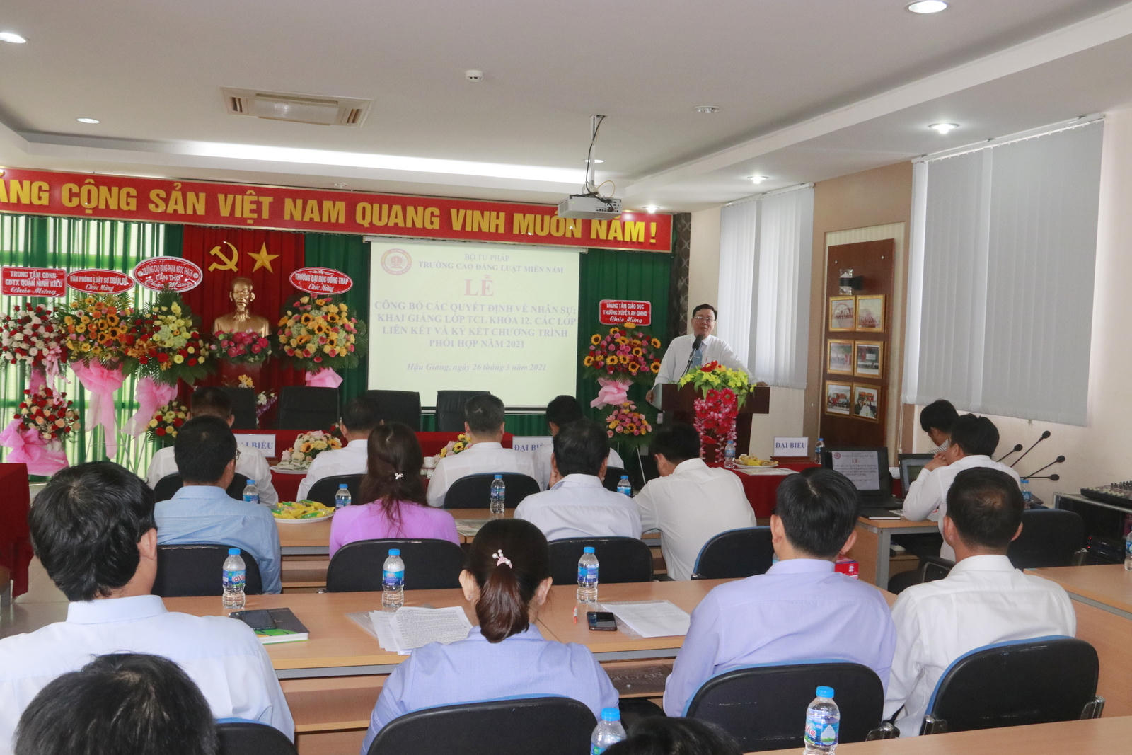 (PLVN) - Ngày 26/3, tại Hậu Giang, Trường Cao đẳng Luật Miền Nam tổ chức Lễ Công bố các quyết định về nhân sự; Khai giảng lớp Trung cấp Luật Khóa 12, các lớp liên kết và ký kết chương trình phối hợp năm 2021.