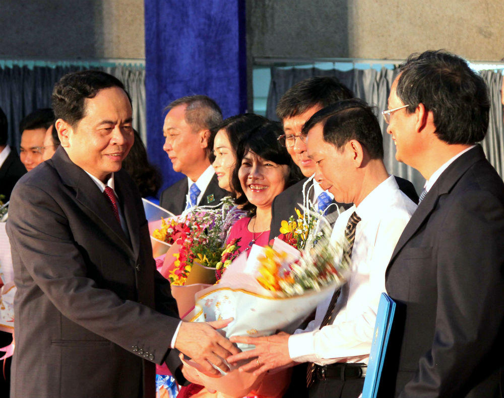 | Chủ tịch UBTƯMTTQ Việt Nam Trần Thanh Mẫn tặng hoa cho các thành viên Hội đồng trường Đại học Cần Thơ |