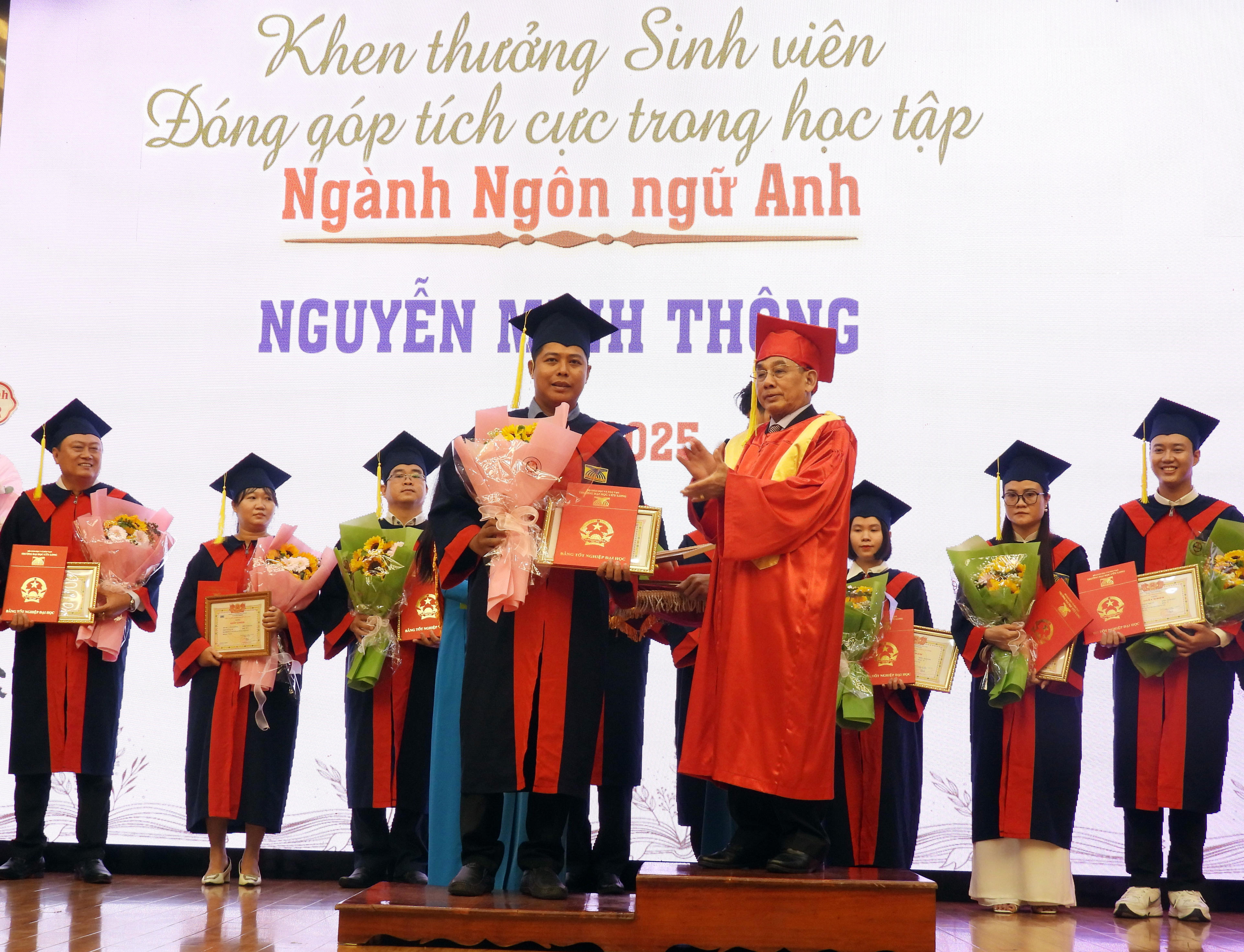 NGƯT.PGS.TS Lương Minh Cừ - Hiệu trưởng Trường Đại học Cửu Long trao giấy khen và bằng tốt nghiệp cho sinh viên. |