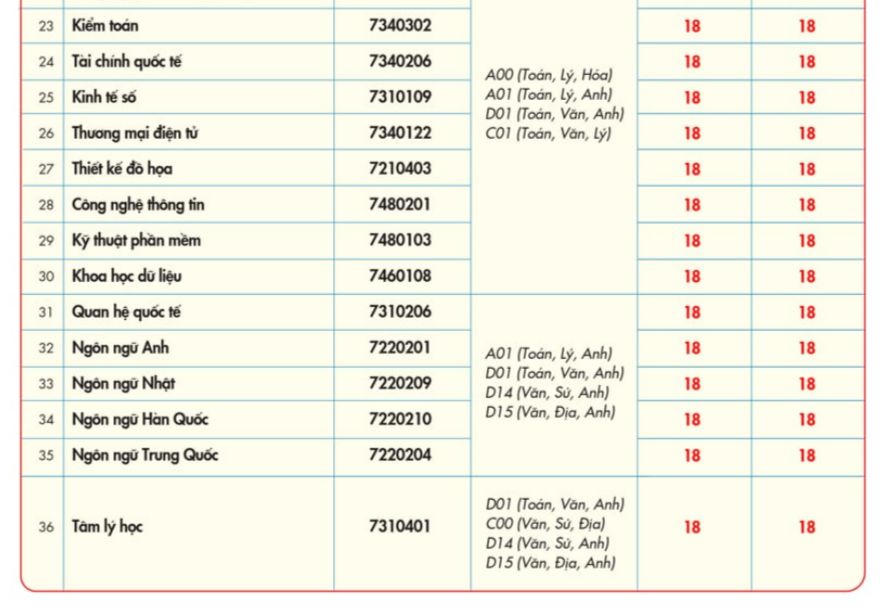Theo đó, mức điểm chuẩn xét tuyển là 18 điểm cho tất cả các ngành ở cả hai phương thức: xét theo tổ hợp 3 môn lớp 12 và xét theo tổng điểm trung bình 3 học kỳ.