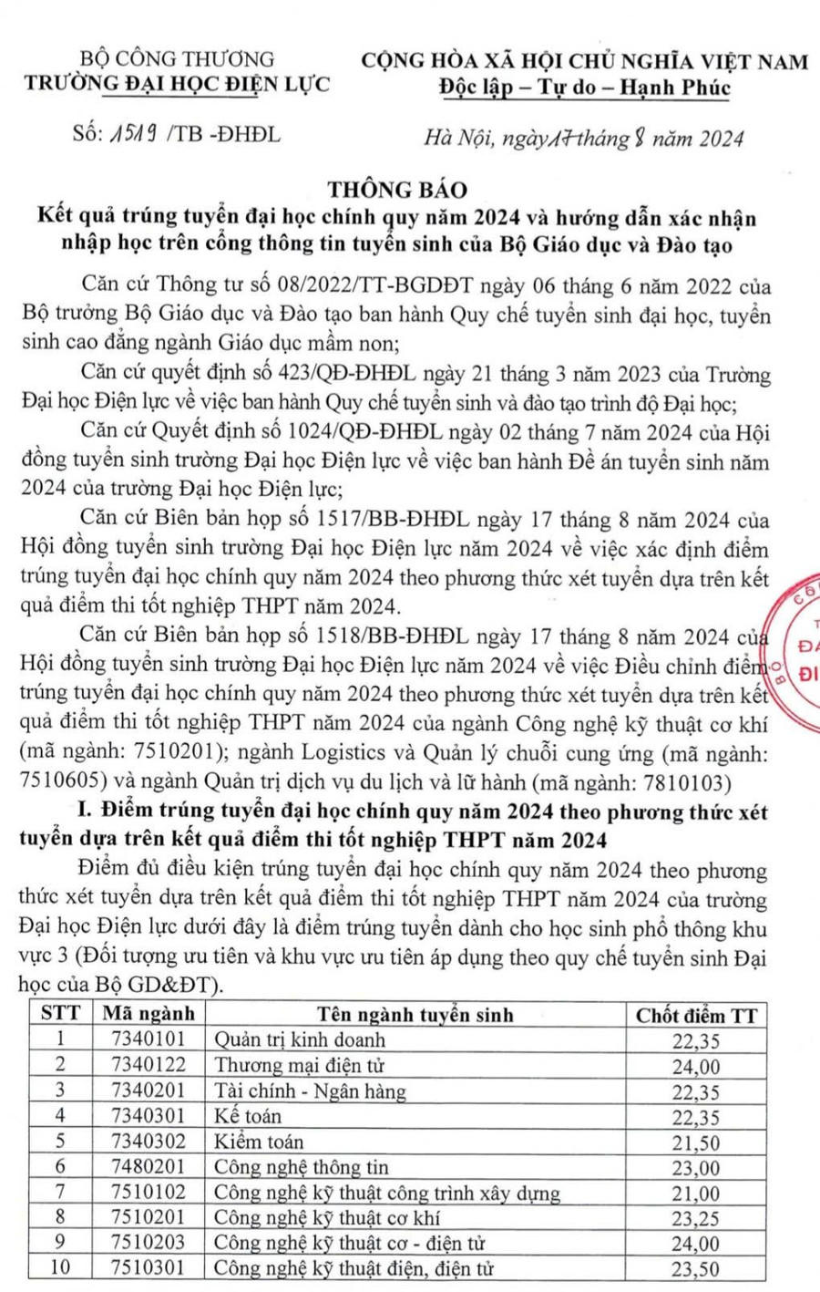 Trường Đại học Điện lực công bố điểm chuẩn năm 2024