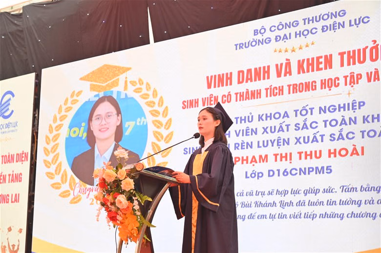 Đại diện cho các tân khoa, tân kỹ sư Phạm Thị Thu Hoài – thủ khoa tốt nghiệp khóa D16 bày tỏ sự trân trọng đối với quá trình học tập và rèn luyện tại Nhà trường. Theo chia sẻ, quãng thời gian đại học không chỉ giúp sinh viên tích lũy kiến thức chuyên môn mà còn là giai đoạn hình thành kỹ năng, bản lĩnh và những giá trị cần thiết cho cuộc sống.