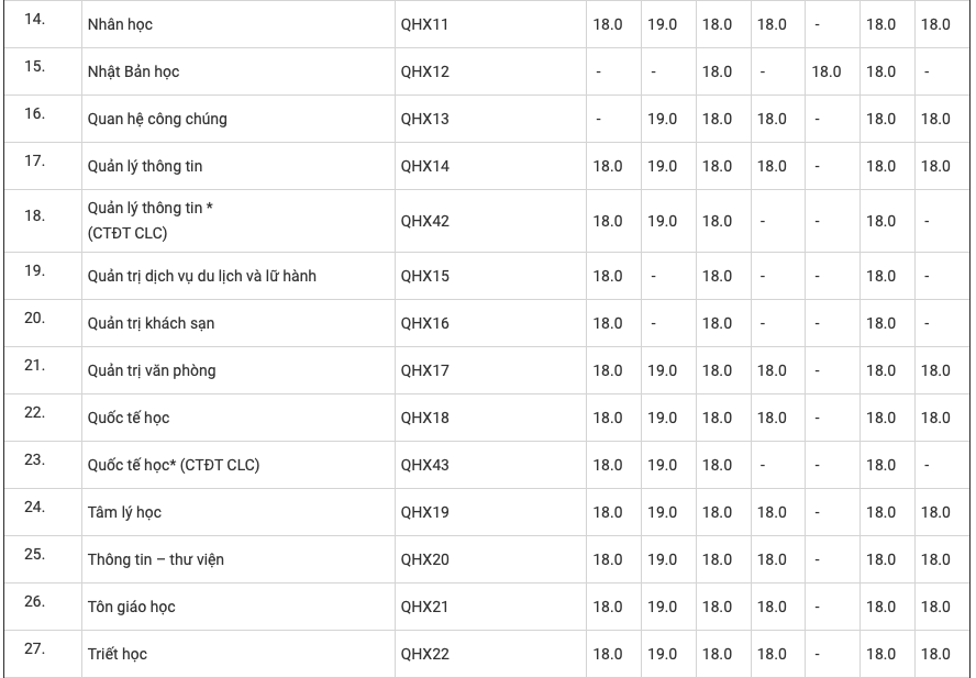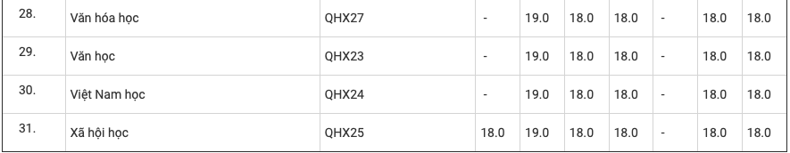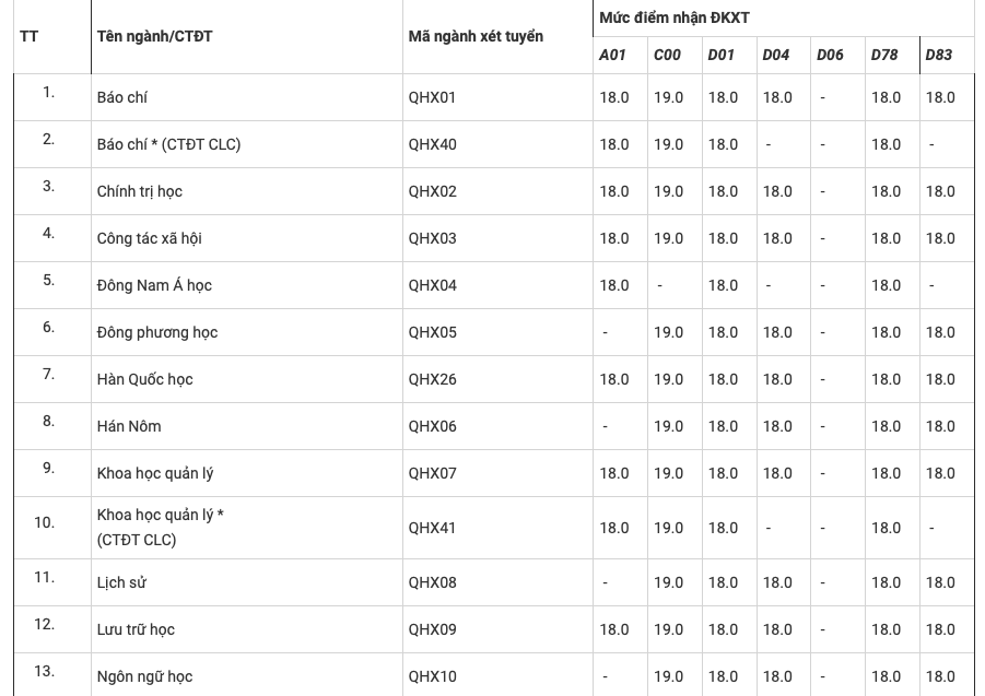 (PLVN) - Trường Đại học Khoa học Xã hội và Nhân văn (KHXH&NV)- Đại học Quốc gia Hà Nội thông báo điểm sàn xét tuyển với 31 ngành chỉ từ 18 đến 19 điểm.