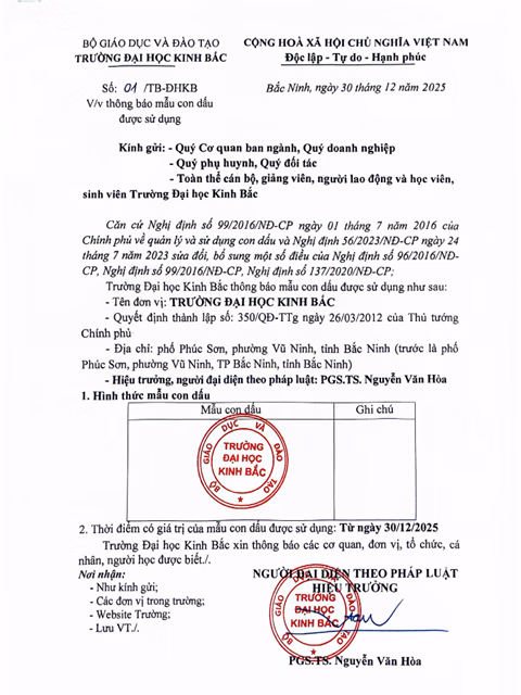 Mới đây, ngày 30/12/2025, trường Đại học Kinh Bắc vừa phát đi thông báo số 01/TB-ĐHKB gửi các cơ quan ban ngành, doanh nghiệp, đối tác về việc mẫu con dấu được sử dụng.