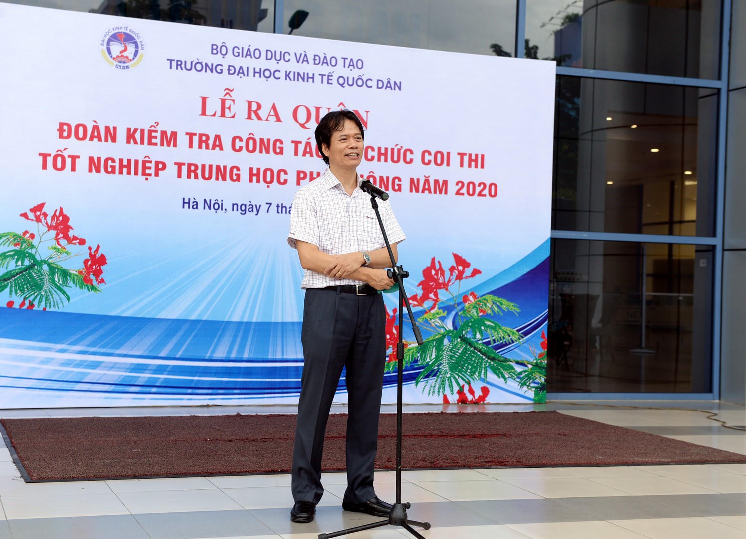 Phát biểu trước giờ lên đường, PGS.TS Phạm Hồng Chương – Hiệu trưởng nhà trường cảm ơn đoàn cán bộ, giảng viên tham gia thực hiện nhiệm vụ tại kỳ thi tốt nghiệp THPT năm 2020 và nhấn mạnh, Trường Đại học Kinh tế Quốc dân mong muốn và tin tưởng, các thầy, cô sẽ hoàn thành xuất sắc nhiệm vụ quan trọng này, đồng thời mỗi thầy cô sẽ là một "người bạn" đồng hành cùng thí sinh và toàn ngành giáo dục trong kỳ thi tốt nghiệp THPT đặc biệt của năm nay. PGS Hiệu trưởng cũng chúc các cán bộ, giảng viên tham gia đoàn kiểm tra thật nhiều sức khoẻ, hoàn thành tốt nhiệm vụ, thực hiện nghiêm túc, an toàn, đúng quy chế tại kỳ thi quan trọng này.