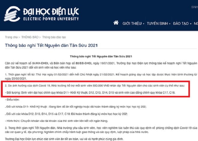 Theo đó, do ảnh hưởng của dịch Covid 19, trường Đại học Điện lực hỗ trợ mỗi sinh viên 500.000 VNĐ nhân dịp Tết Nguyên đán cho các sinh viên cụ thể như sau: