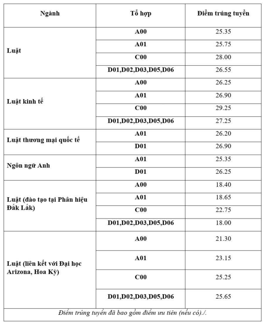 Tổ hợp xét tuyển C00 của Ngành Luật Kinh tế có điểm trúng tuyển là 29,25 điểm; kế đó điểm trúng tuyển đối với tổ hợp C00 của Ngành luật là 28, tổ hợp D01 của Ngành luật là 26,55. Các ngành còn lại chủ yếu có điểm trúng tuyển từ 25 đến 27,25 điểm, riêng các tổ hợp của ngành Luật tuyển sinh tại Phân hiệu của Trường tại Đắk Lắk có điểm trúng tuyển từ 18.40 đến 22.75 điểm.