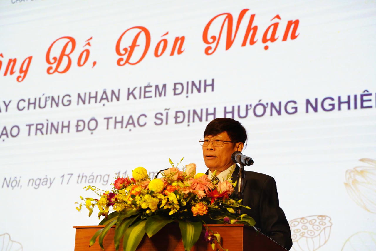 Đại diện lãnh đạo Trung tâm KĐCLGD Thăng Long, TS. Nguyễn Văn Đường - Giám đốc Trung tâm chúc mừng nhấn mạnh kết quả ngày hôm nay là sự nỗ lực của toàn trường, trong đó phải kể đến đội các thầy cô trong ban lãnh đạo đã có những chỉ đạo quyết liệt, các thầy cô giảng viên, viên chức, người lao động, người học đã cung cấp minh chứng và phối hợp với trung tâm để đưa ra các số liệu, dữ liệu thông tin làm cơ sở cho việc nhận định, đánh giá cho 07 chương trình đào tạo thạc sĩ định hướng nghiên cứu của Nhà trường. TS. Nguyễn Văn Đường hy vọng rằng sau 02 năm nữa trở lại, Nhà trường sẽ cung cấp báo cáo đánh giá giữa kì với tất cả kết quả khắc phục khuyến nghị cải tiến chất lượng mà Đoàn đánh giá ngoài đã đưa ra trước đó.