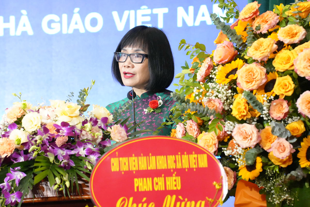 Thứ trưởng Đặng Hoàng Oanh và Hiệu trưởng Đoàn Trung Kiên tặng hoa và quà cho PGS. Phan Thị Luyện, Phó Trưởng Khoa Lý luận chính trị. |