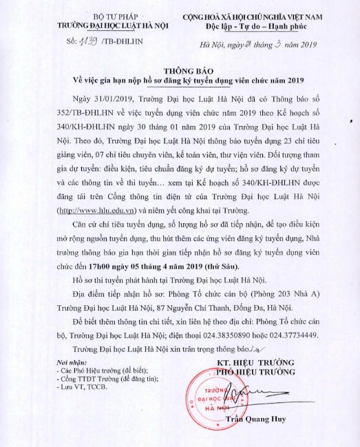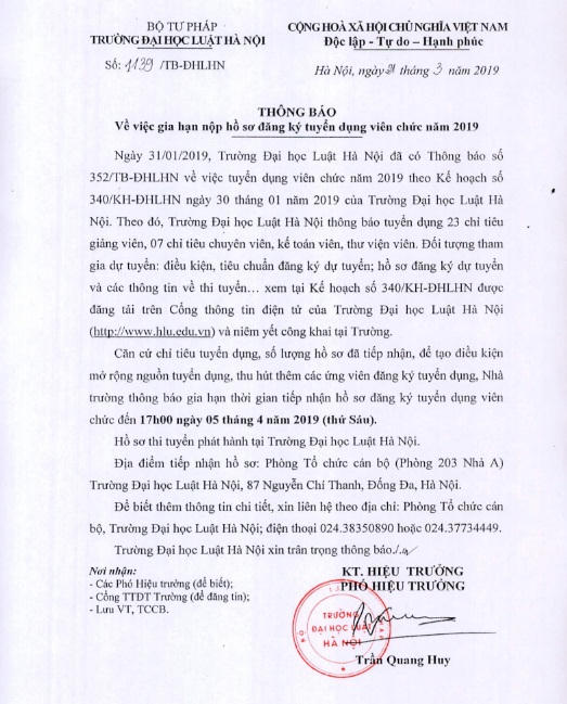 Trường Đại học Luật Hà Nội thông báo gia hạn nộp hồ sơ đăng ký tuyển dụng viên chức năm 2019 Thứ Hai 25/03/2019 08:00 (GMT+7)