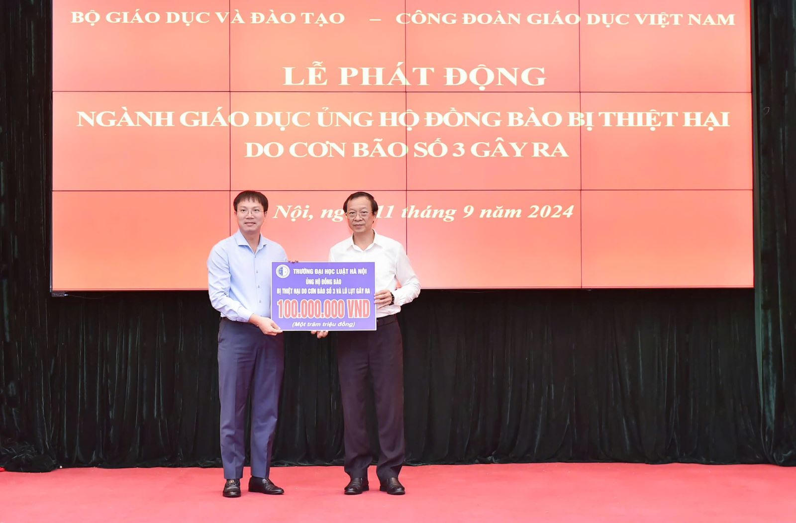 Chiều ngày 11/9, tại "Lễ phát động ngành Giáo dục ủng hộ đồng bào bị thiệt hại do bão số 3” do Bộ Giáo dục và Đào tạo và Công đoàn Giáo dục Việt Nam tổ chức, thay mặt tập thể Trường Đại học Luật Hà Nội, TS. Đoàn Trung Kiên - Hiệu trưởng Nhà trường đã trao số tiền 100.000.000 đồng, góp phần hỗ trợ đồng bào các tỉnh khu vực miền Bắc đang bị thiệt hại nặng nề trong cơn bão số 3.