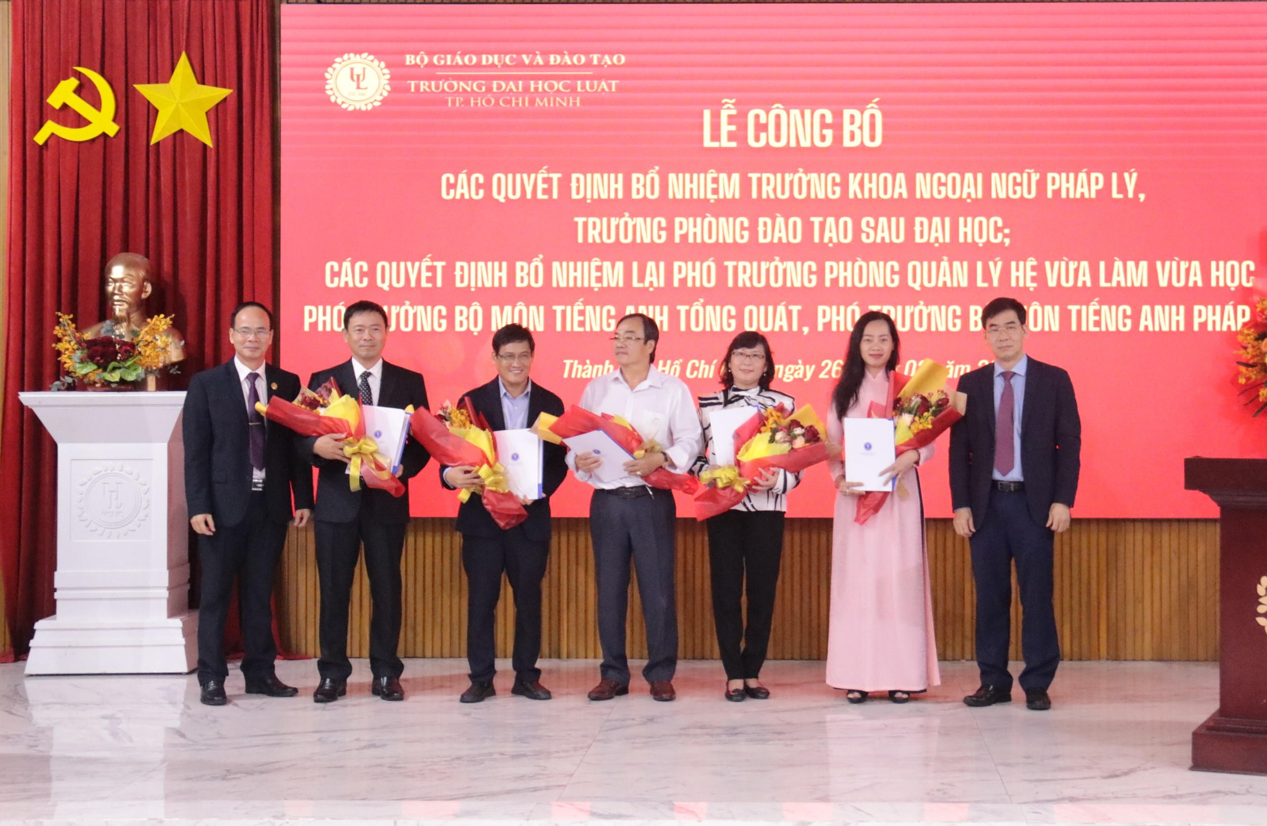 Cũng tại buổi lễ, Trường ĐH Luật TP HCM đã trao quyết định bổ nhiệm, bổ nhiệm lại cho các Trưởng khoa, Trưởng phòng, Phó Trưởng phòng, công bố Quyết Định bổ nhiệm chức danh Phó Giáo sư đối với PGS.TS. Lưu Quốc Thái.