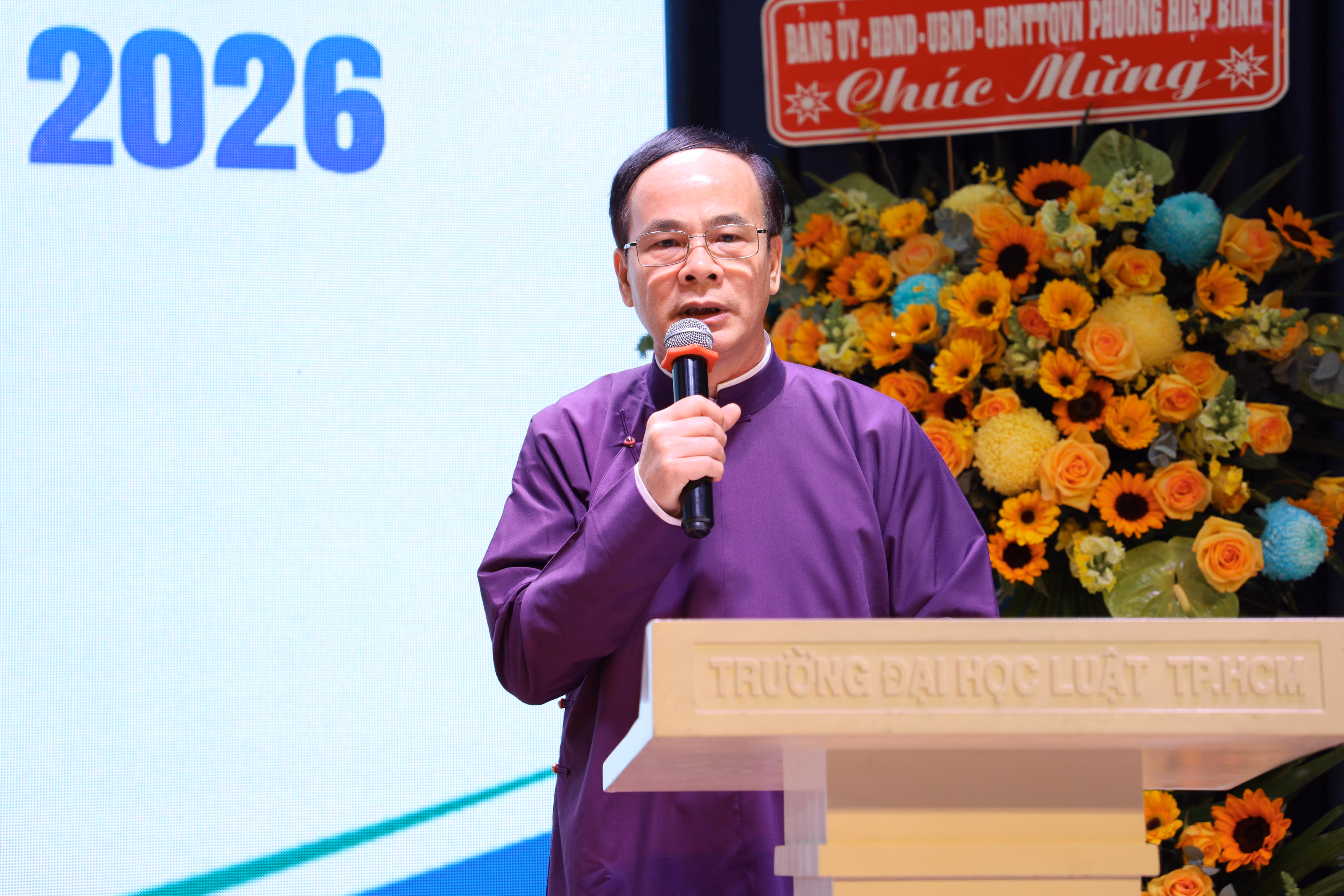 Phát biểu khai mạc, TS. Lê Trường Sơn - Hiệu trưởng Trường Đại học Luật TP HCM gửi lời chúc mừng năm mới và bày tỏ lòng biết ơn sâu sắc đến toàn thể viên chức, người lao động. Ông nhấn mạnh, buổi gặp mặt tất niên không chỉ là dịp tổng kết hoạt động năm 2025 mà còn là không gian kết nối các thế hệ cán bộ, giảng viên đã từng gắn bó với Nhà trường, đồng thời tri ân các thành viên Hội đồng Trường đã hoàn thành sứ mệnh kể từ ngày 1/1/2026.