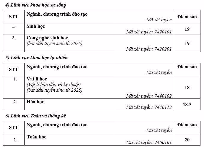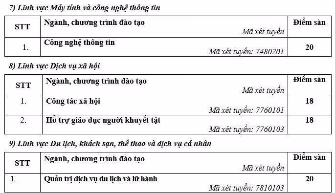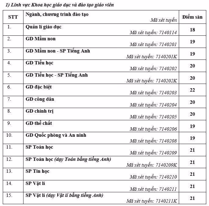 Trước đó, Trường Đại học Sư phạm Hà Nội đã công bố điểm sàn theo phương thức xét điểm thi tốt nghiệp THPT, dao động từ 18 đến 21 điểm. Trong đó, ngành Giáo dục đặc biệt và Sư phạm Lịch sử có điểm sàn cao nhất với 22 điểm. Điểm cụ thể như sau: