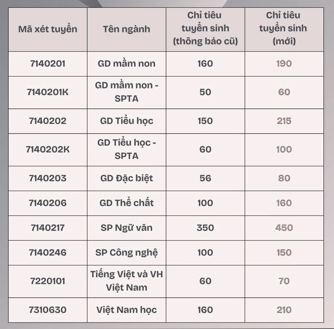 Những ngành có thay đổi chỉ tiêu bao gồm: Giáo dục mầm non; Giáo dục tiểu học; Giáo dục đặc biệt; Giáo dục thể chất; Sư phạm ngữ văn; Sư phạm công nghệ; Tiếng Việt và Văn hóa Việt Nam; Việt Nam học. Chỉ tiêu tăng cụ thể như sau: