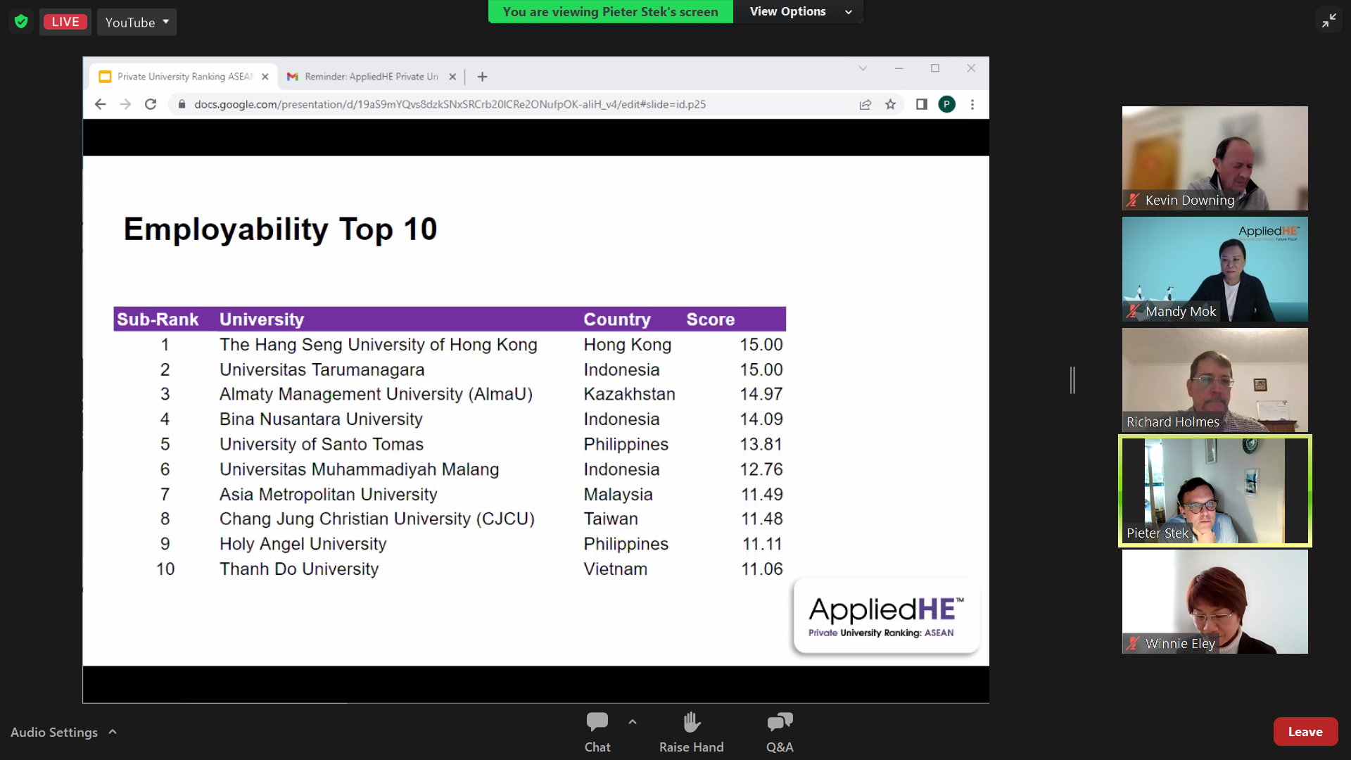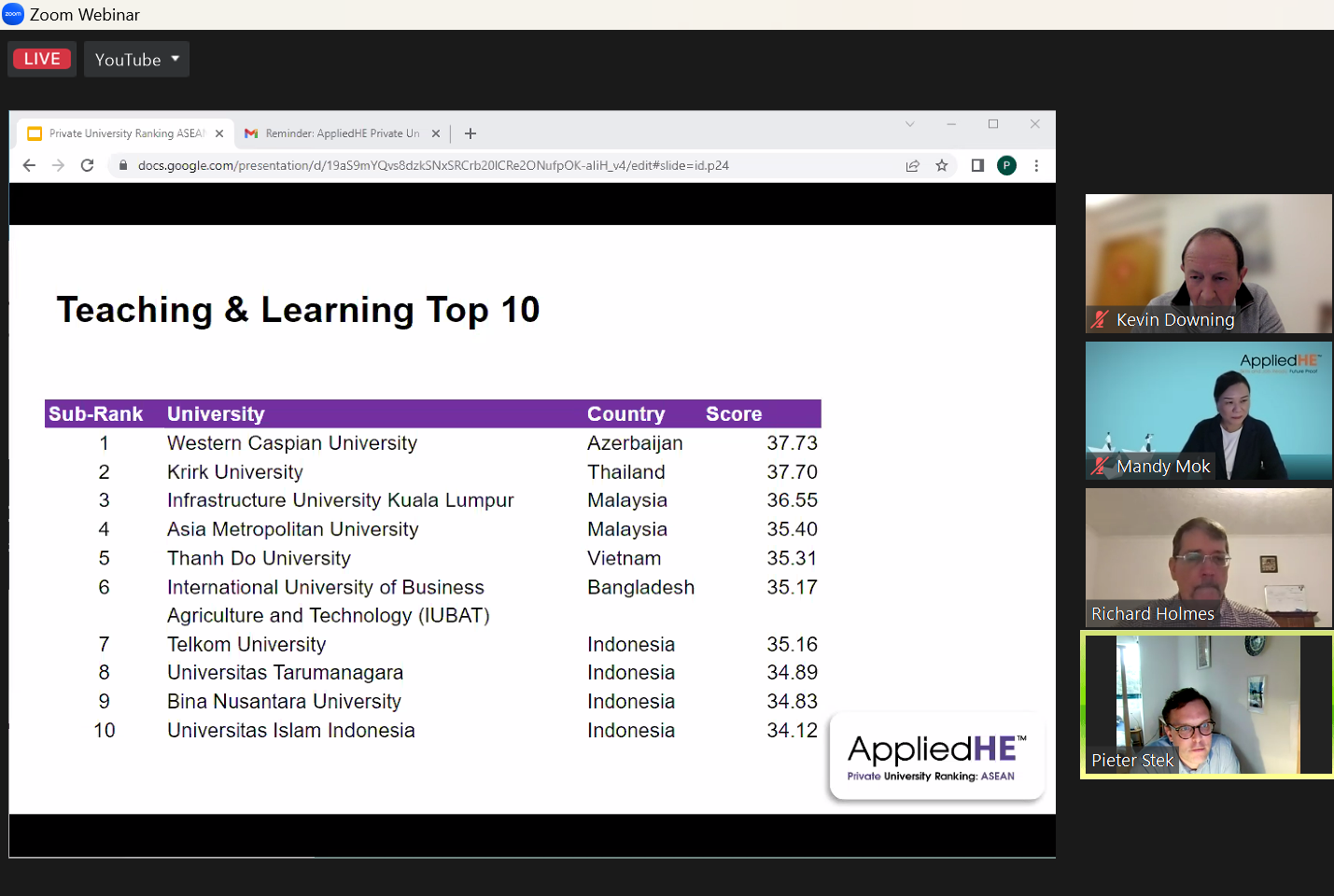 Bàn luận về nhu cầu xếp hạng trường đại học tư thục, Chủ tịch Hội đồng Cố vấn Xếp hạng của AppliedHE và Thư ký Hội đồng và Tòa án của Đại học Thành phố Hồng Kông, Tiến sĩ Kevin Downing nhận xét rằng: “Các trường đại học tư thục khác với các trường đại học công lập, và thế mạnh của các trường đại học tư thục đang không được thể hiện rõ ràng trên các bảng xếp hạng đại học hiện có. Do đó, Bảng xếp hạng các trường đại học tư thục của AppliedHE là một sự bổ sung đáng hoan nghênh cho bối cảnh xếp hạng châu Á và toàn cầu.”