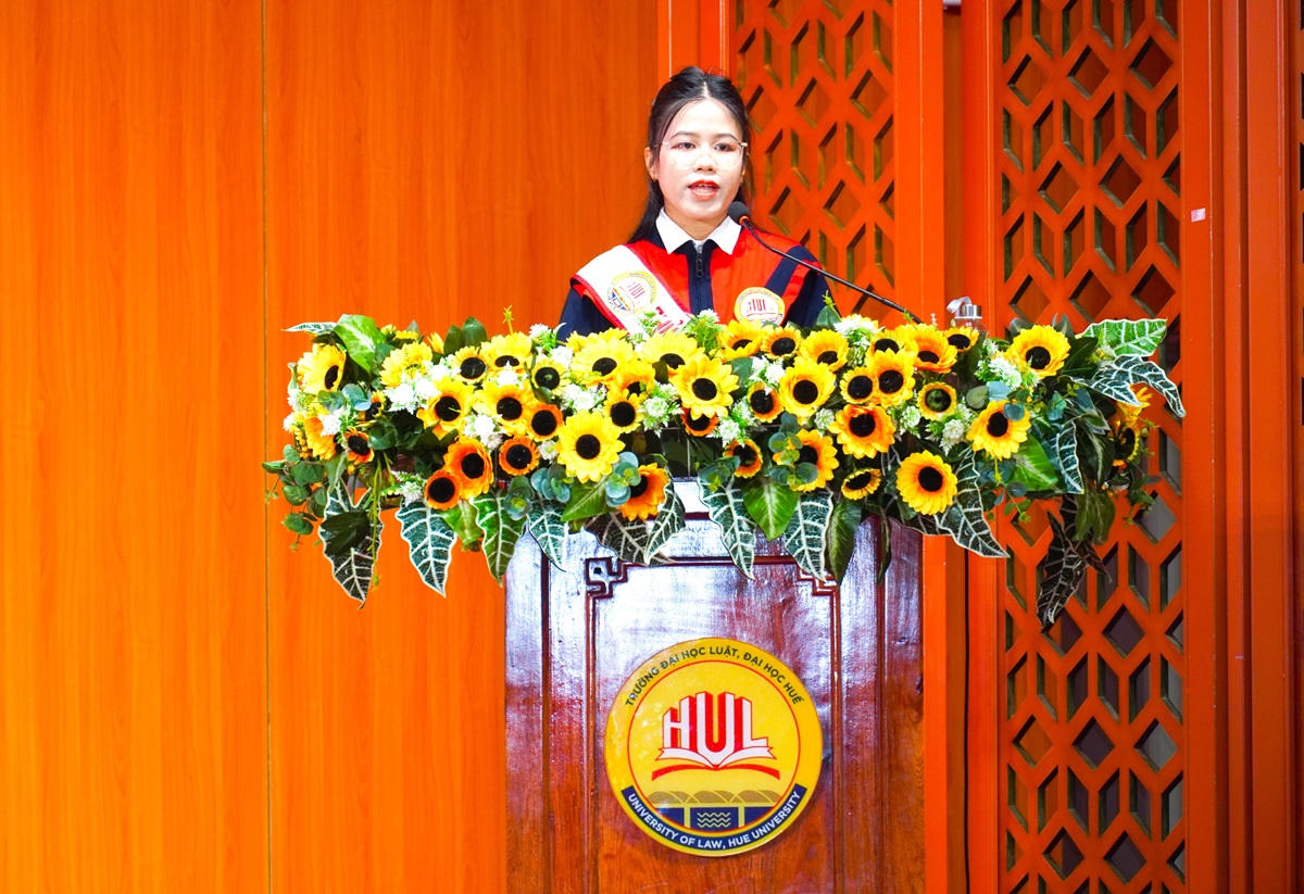 Đại diện cho các sinh viên tốt nghiệp, tân cử nhân Hồ Thị Thu Ngọc, thủ khoa ngành Luật Kinh tế đã bày tỏ lòng biết ơn sâu sắc đến quý thầy cô, gia đình và bạn bè, những người luôn đồng hành trong suốt chặng đường đại học. Chúng em sẽ luôn ghi nhớ những ngày tháng học tập đầy thử thách nhưng cũng đong đầy yêu thương tại Trường ĐH Luật, ĐH Huế nơi đã truyền cho chúng em kiến thức, lý tưởng và lòng tự hào về nghề nghiệp mà mình đã chọn; và hứa sẽ tiếp tục phấn đấu trên con đường phía trước để không phụ lòng thầy cô, cha mẹ.