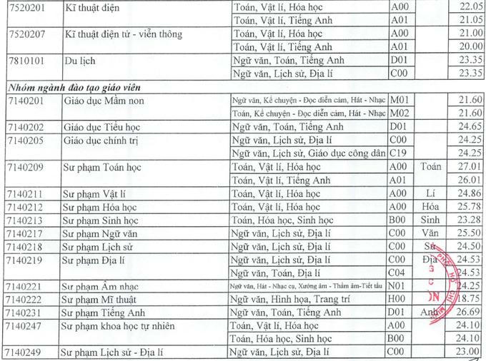 Điểm cao nhất ở ngành Sư phạm Toán học 27,01; tiếp đó là Sư phạm Tiếng Anh 26,69. Nhiều ngành khác có điểm chuẩn trên 24 như: Giáo dục Tiểu học, Giáo dục chính trị, Sư phạm Vật lý, Sư phạm Hóa học, Sư phạm Ngữ văn, Sư phạm Địa lý, Sư phạm Lịch sử, Sư phạm Âm nhạc, Sư phạm Khoa học tự nhiên.